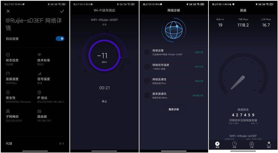 光嘴上说信号强劲是没有什么实际效果的,这里我将从家里的各种情况来对这款路由器进行信号测试,这张图是在客厅的情况,这里能够看到WIFI信号强度为-11dBm信号强度为极好,从WIFI信息中也能够看到连接速率为1201Mbps,进行网络测试,能够看到下载速率能够达到1118.2Mbps,我的千兆宽带能跑满。