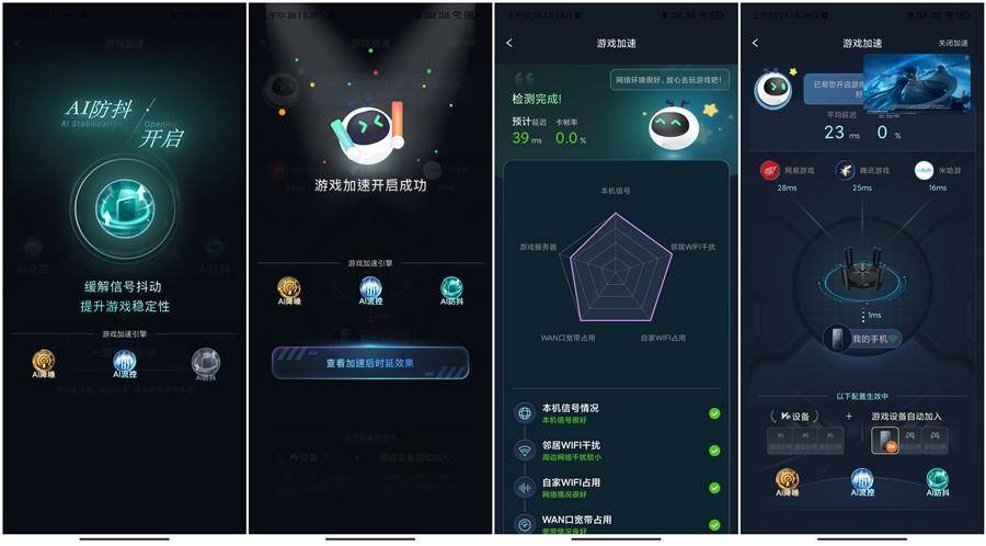 而当下的游戏,对网络的需求越来越高。高清晰度的画面、复杂的游戏场景、实时的互动都要求网络具有高速、低延迟的特性。锐捷GameFast 游戏加速引擎3.0的三重AI⿊科技:AI防抖、AI流控、AI降噪。能够有效的保证游戏体验,不用担心距离远,邻里路由信号干扰,以及其他设备抢网等问题。
