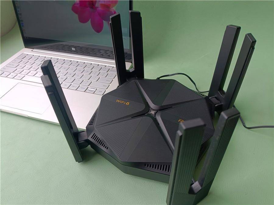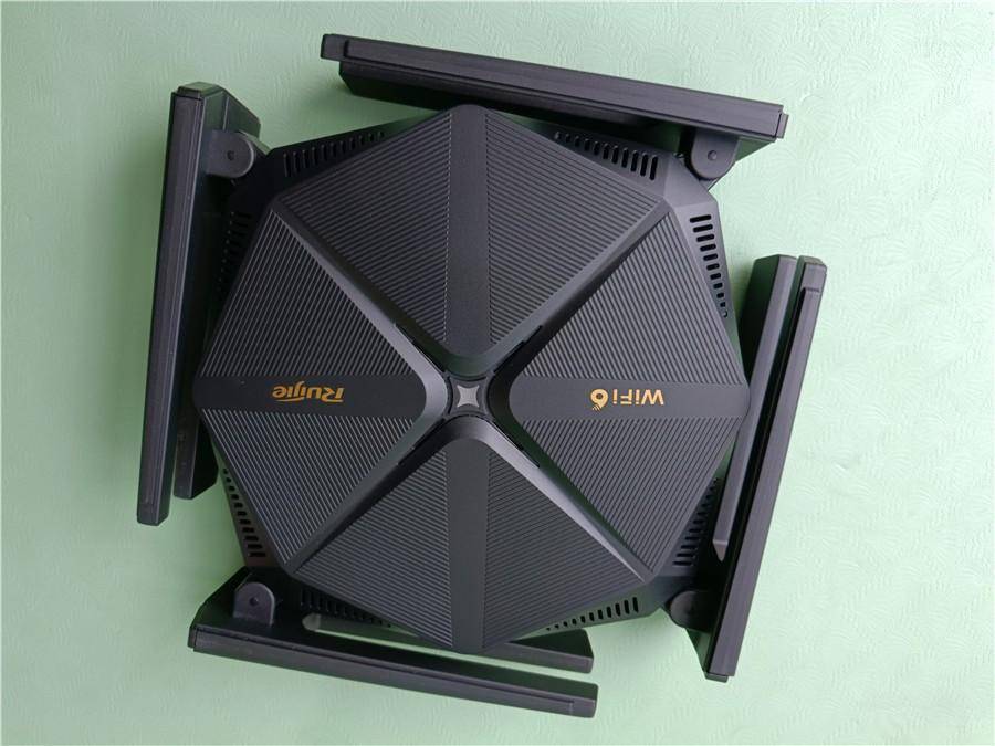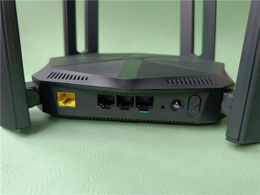 特写下这款路由器,能够看到这款路由的8根天线两两一组,通过折叠后也非常的节省空间。另外从上面能够看到这款路由器也在顶部设计了一些散热孔的。可能会有人说隐藏天线不是更好么,但是隐藏天线真的信号好么?从这个图也能够看到这款路由器支持WIFI6,目前市面上已经存在WIFI7路由以及设备了,但是个人感觉WIFI6够用且稳定。