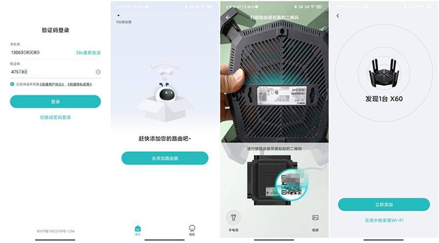 锐捷天蝎X60 new搭配了锐捷星耀家APP 可以从手机应用市场下载使用。这里能够看到下载后进行登录就能够添加路由器了,添加非常的方便,通过扫描路由器底部二维码就能够自动识别路由,点击添加即可。