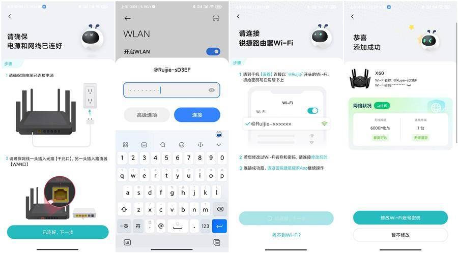 接线方面将宽带网线插入WAN口,手机连接上无线路由的新号就可以进行下一步配置了,配置完成后可以看到恭喜添加成功界面。