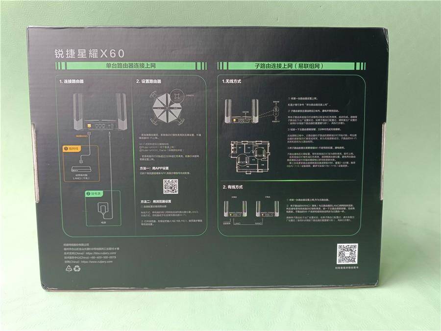 路由器包装背面简单展示了路由器接线的单路由以及组网配置方法,整体来说简单明了。在下面的配置方面通过APP的步骤一步一步配置也是非常的简单,配置过程请看下文。