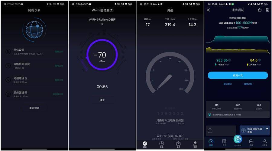 这里是两堵墙较远的情况下测试,能够看到信号强度到了-70dBm降到了强的状态,使用测速软件进行测试,也能够达到300Mbps。从以上测试能够看得出来这款路由信号确实强劲。