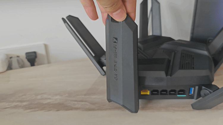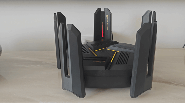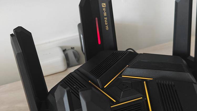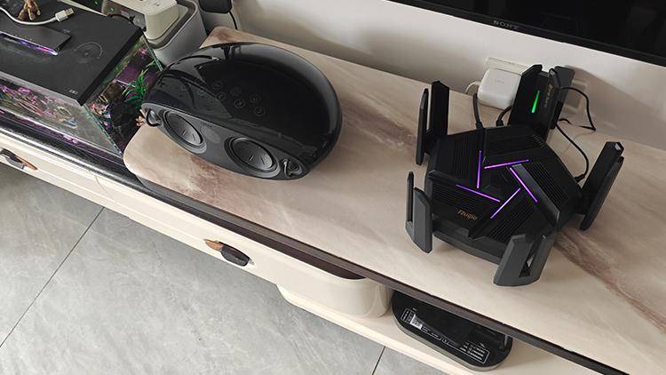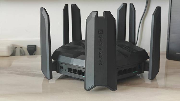 锐捷天蝎BE72 Pro电竞路由器,每个角都配备一个如同天蝎钳的天线,一共有9根高增益天线,其中5根为5G频段,4根为2.4G频段的天线,理论上总的传输速率能够达到7200Mbps。