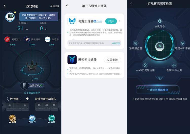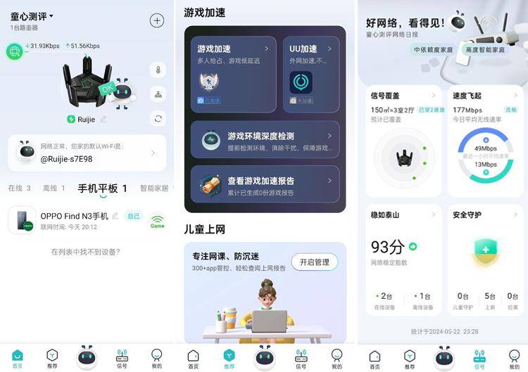 在锐捷星耀家APP中,功能还是比较丰富的,无需电脑就可以轻松进行路由器的一些功能设,非常的便捷。比如儿童上网可以进行合理控制管理,这样就不会耽误孩子因过度上网耽误学习。在APP界面中可以看到当前路由器连接设备情况,还有信号覆盖等,都一目了然。这款号称电竞路由器,最特别的自然是游戏加速这功能模块的加入。