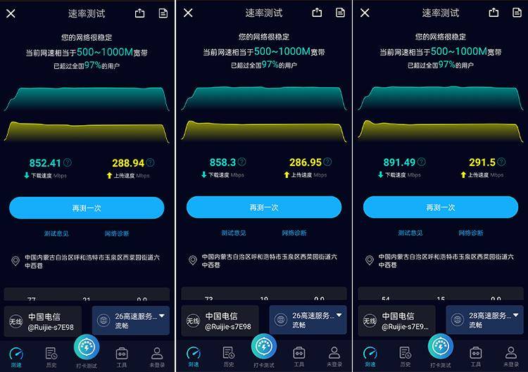 路由器在实际网速测试方面,这首款WIFI7路由器,表现毋庸置疑,相当不错。首先是在客厅,用网速测试软件,进行3次网速,得出下面三个数据值,最后求出平均值,下载速度都在867Mbps,上传在288Mbps,相当给力了。