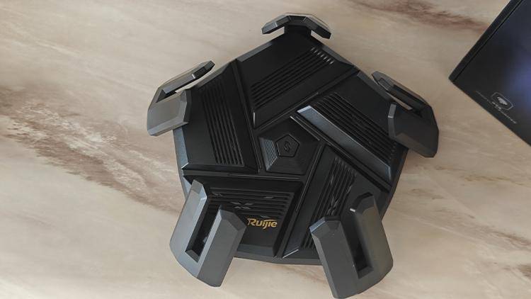 外观上,锐捷天蝎BE72 Pro电竞路由器个头比较大,整体采用天蝎系列的一贯风格棱角分明流线型设计,炫酷的电竞感逼格直接拉满。此次采用五边形的造型,顶部设计了RGB氛围灯带以及散热栅格,从上看造型就像一个大风车,工艺设计上堪称惊艳。