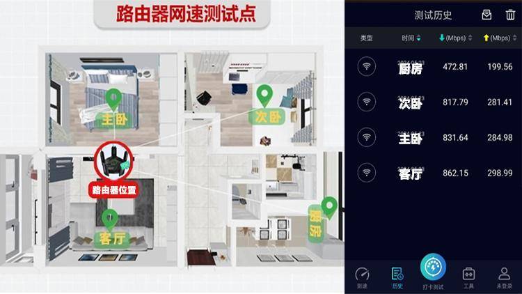 最后,通过多点测试,客厅、主卧、次卧、厨房这四个地方进行网速测试,实际的表现也是非常满意。这款路由器在穿墙能力真的很强悍,一点不夸张。通过测试点位置可以看到,客厅:下载速度在862Mbps,上传在298Mbps;主卧隔着一堵墙,但是网速主卧:下载速度在831Mbps,上传在284Mbps。次卧一堵墙加一个门:下载速度在817Mbps,上传在281Mbps。而在网络最差的厨房,在三堵墙加距离最远的条件下,都能达到下载速度在472Mbps,上传在199Mbps。以前的路由器,只能是望尘莫及,这也是我换路由器的一个原因,就是解决厨房位置没有WiFi困扰。
