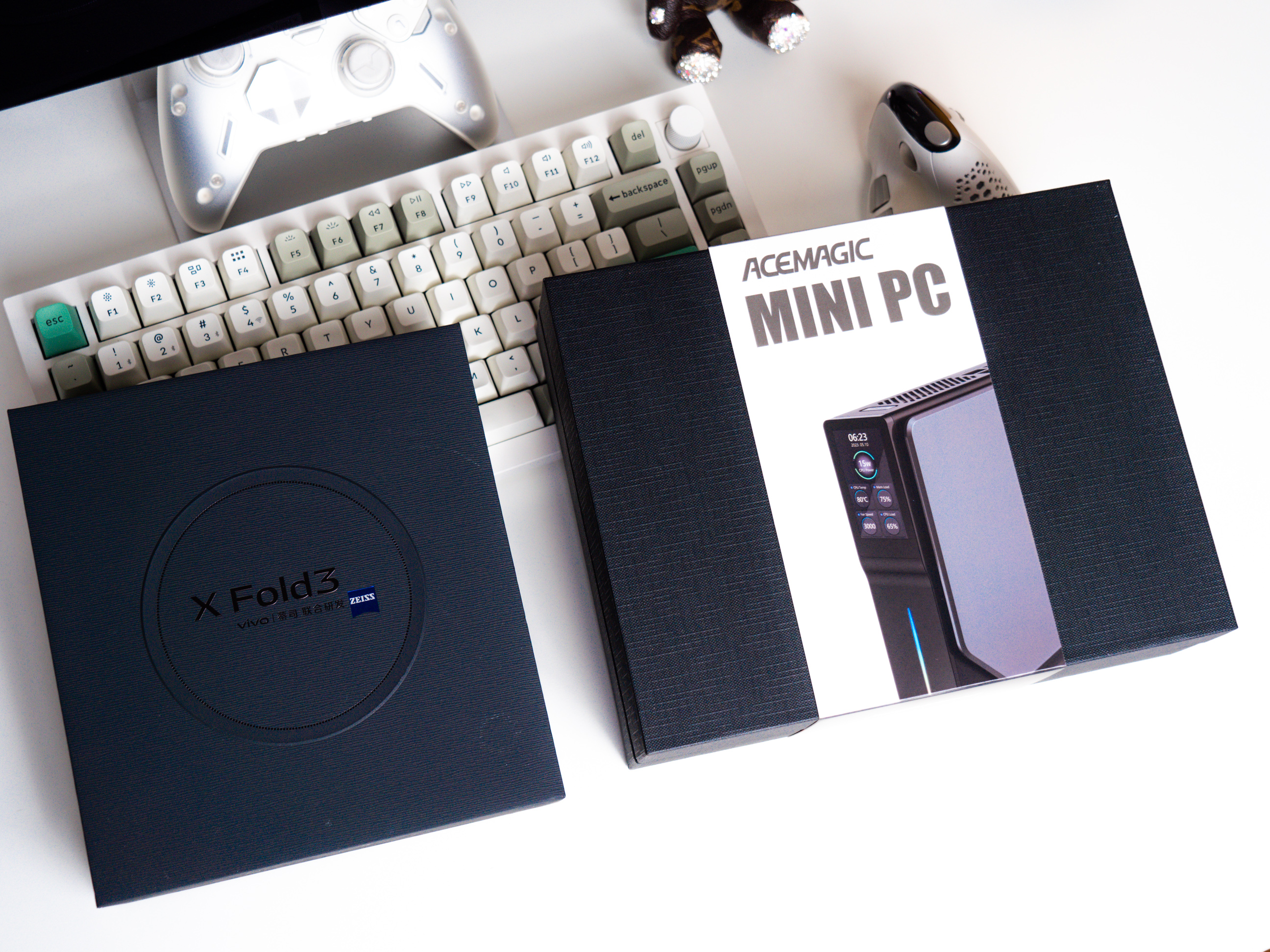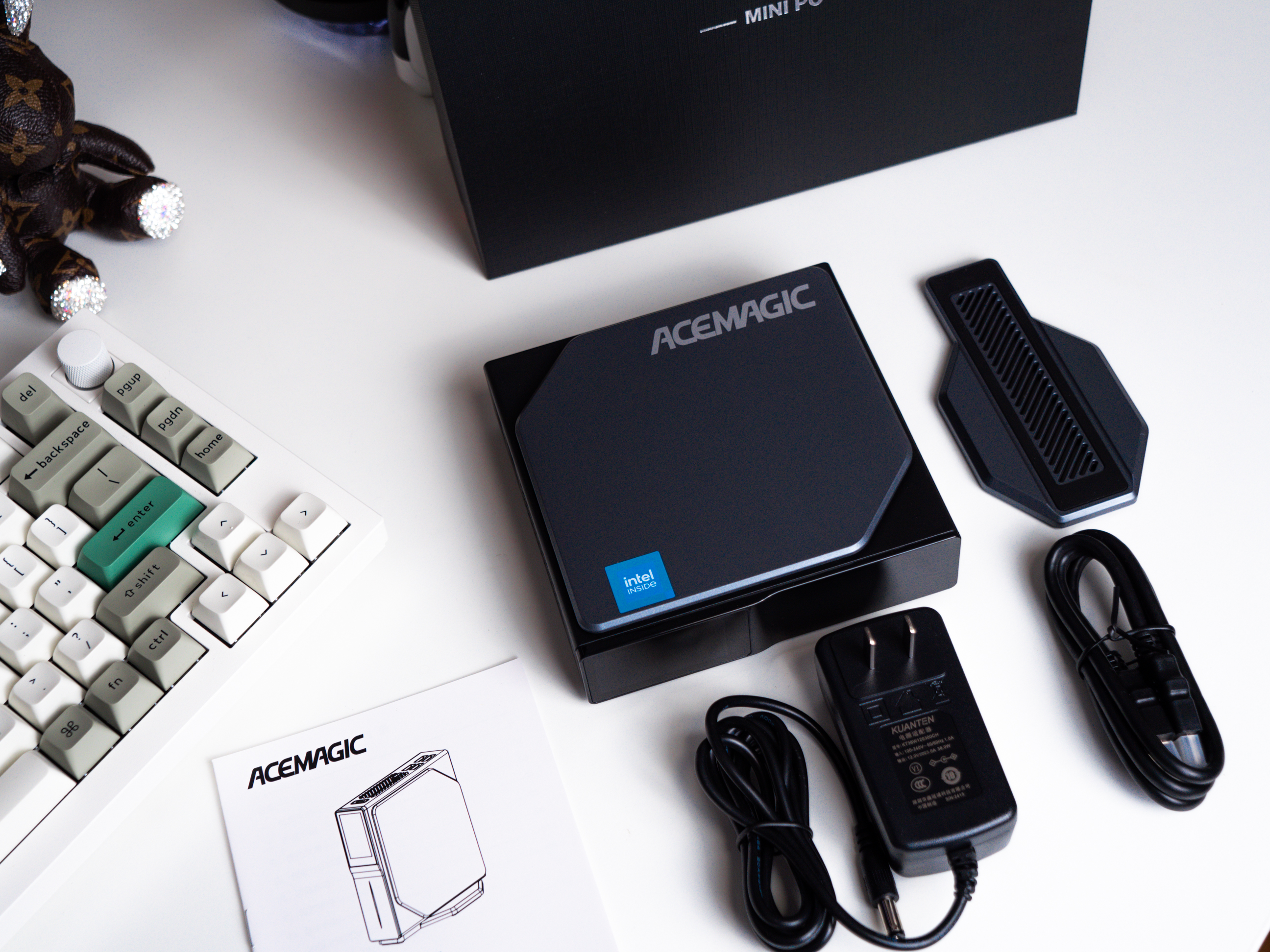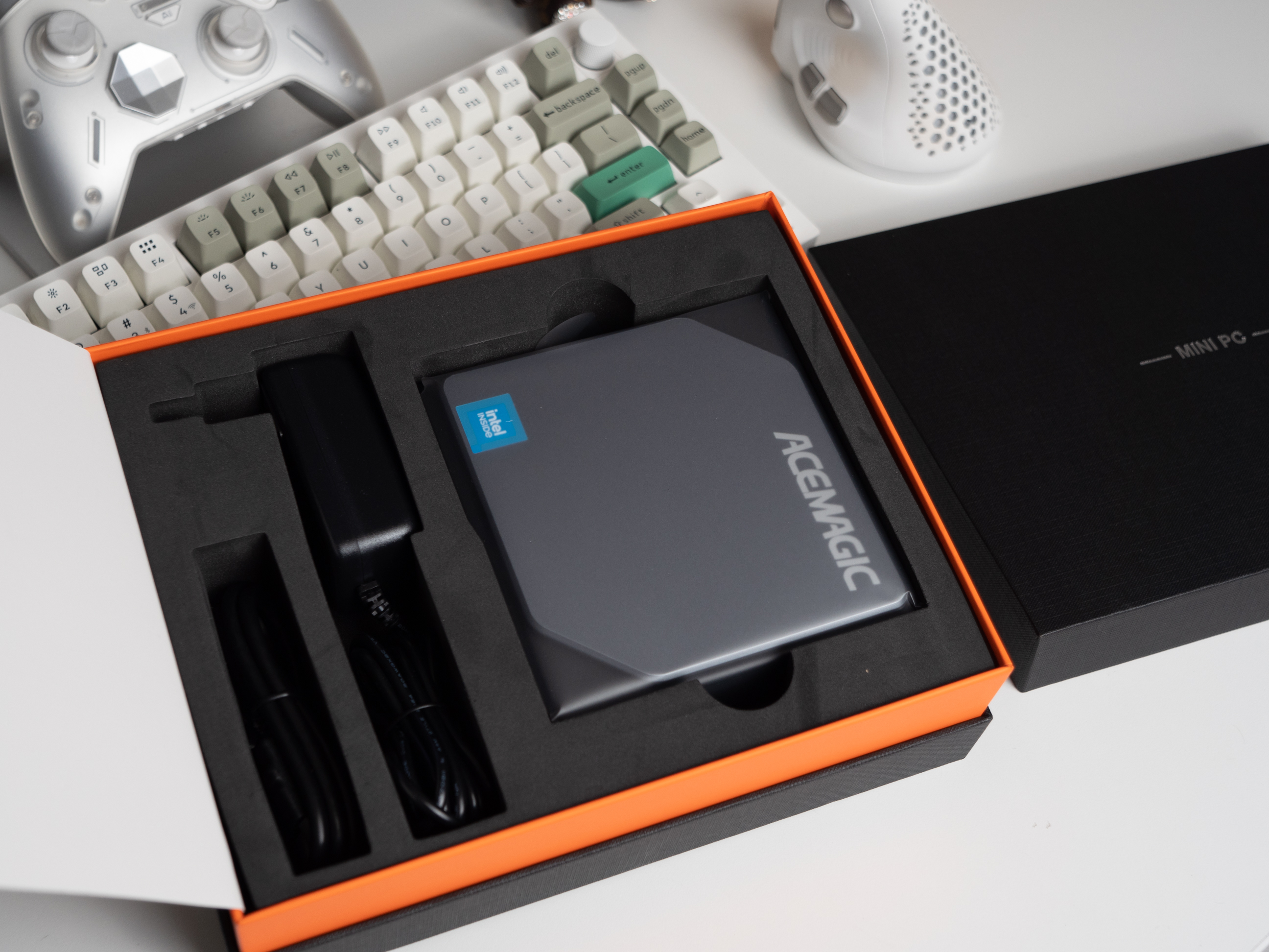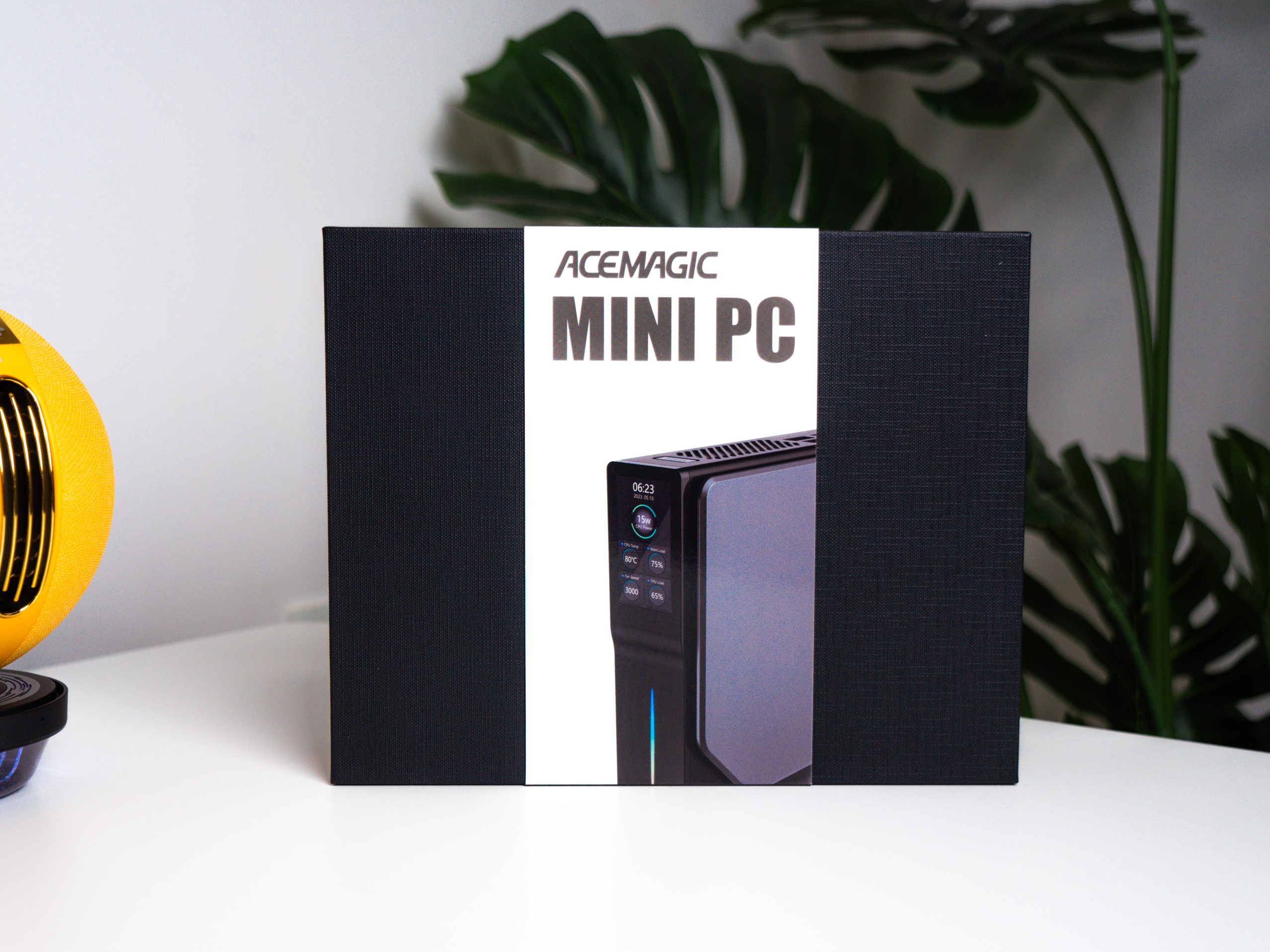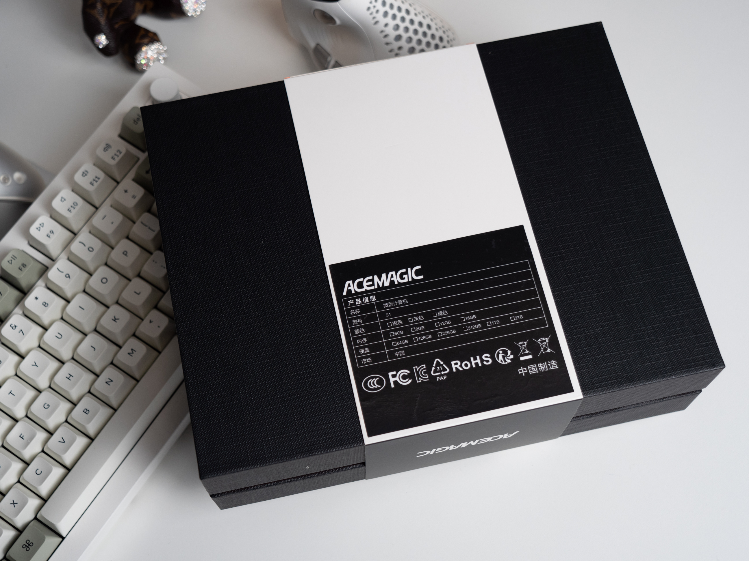 以手机包装盒作为参考,这台迷你电脑的包装确实够迷你,正面也展示了一部分电脑实物,暂时难窥全貌。