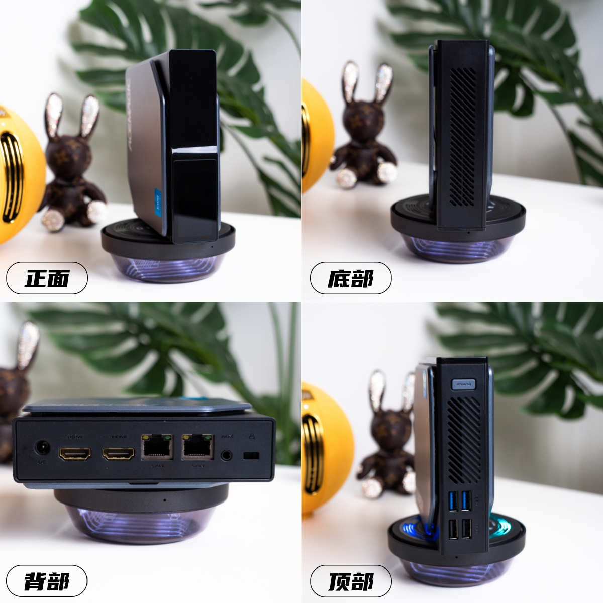 比如正面有隐藏式镜面元素,顶部设置了电源键+USB接口以及散热格栅,背部是DC供电接口+双HDMI接口+双千兆网口+3.5mm音频接口和防盗锁口,底部则完全是散热格栅,打通了顶部的散热风道。