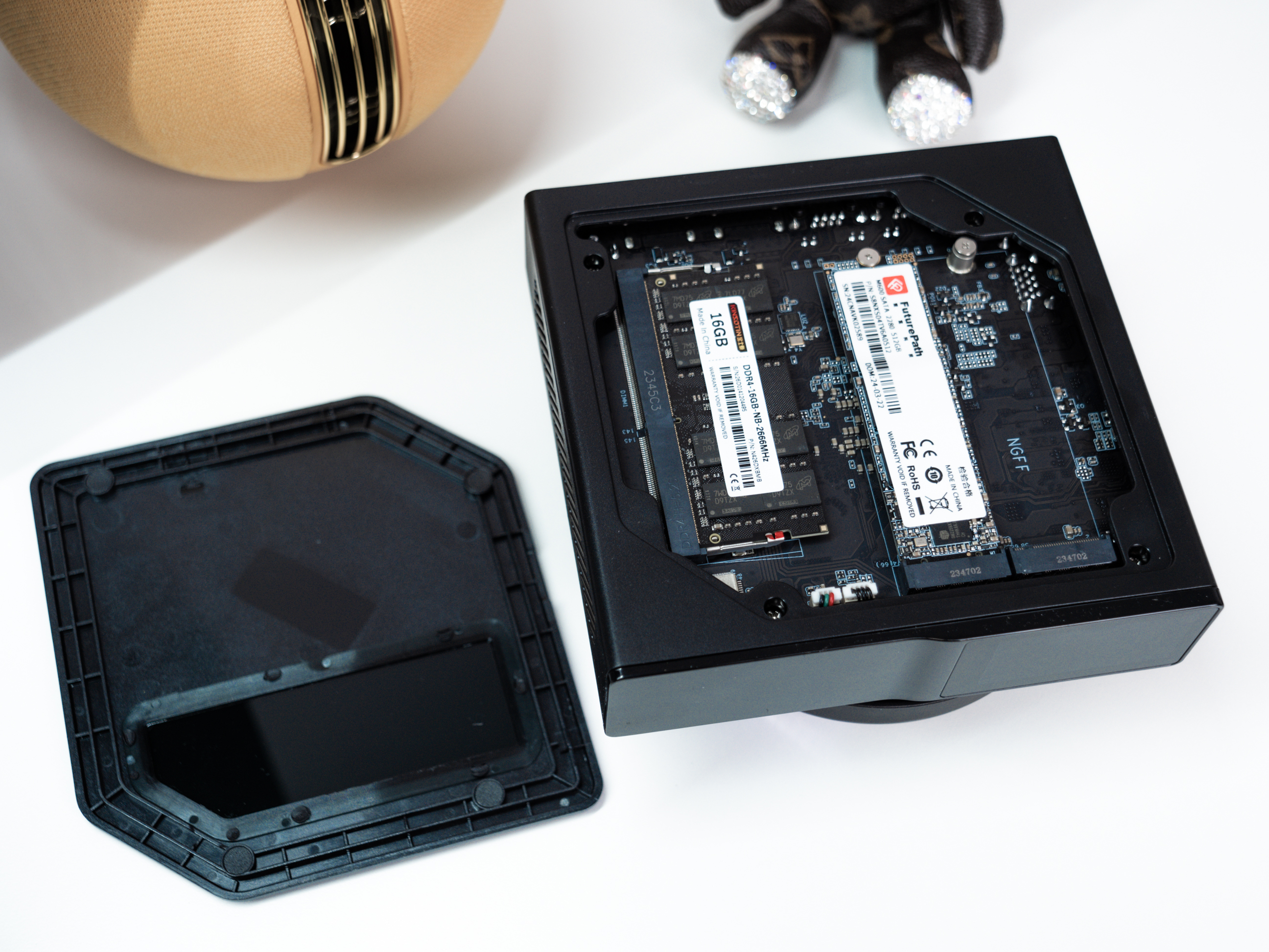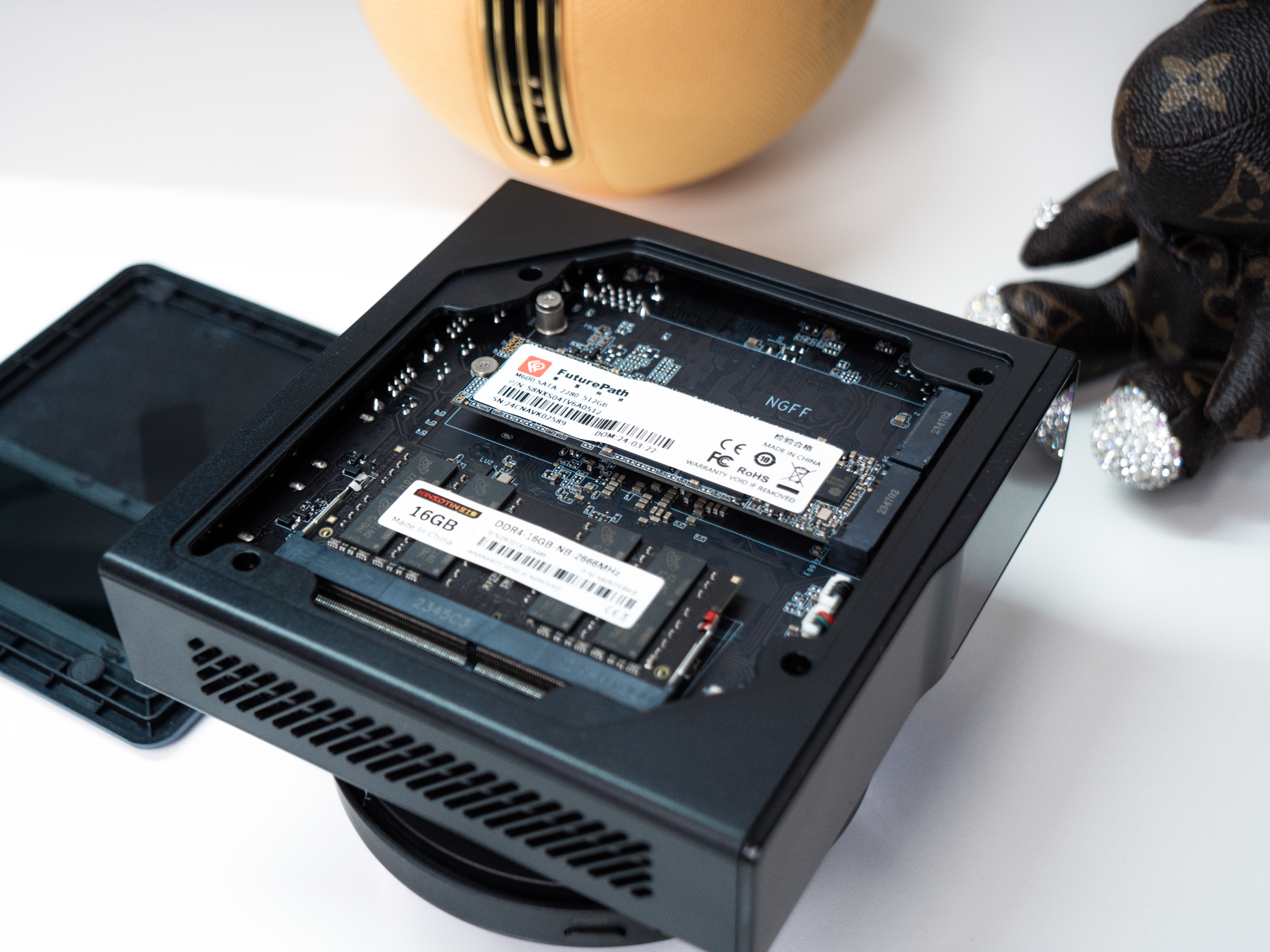 侧面采用了磁吸式盖板,轻松取下又不易掉落。而且在寸土寸金的迷你空间内,还提供了一定的可扩展性:双M.2 2280硬盘插槽,对于AIO玩法有一定的帮助。