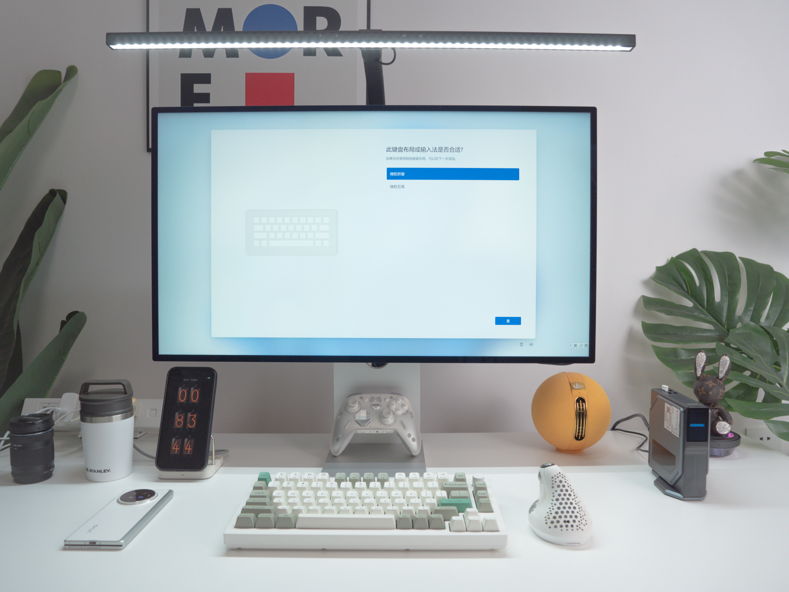 基本上根据系统指引一步一步点击确认就行,整个过程大概4-5分钟就激活完成并进入桌面了。对于喜欢简约桌面或是桌面尺寸较小、空间有限的用户而言,阿迈奇S1这种小巧的迷你电脑比水杯占得地儿都少。