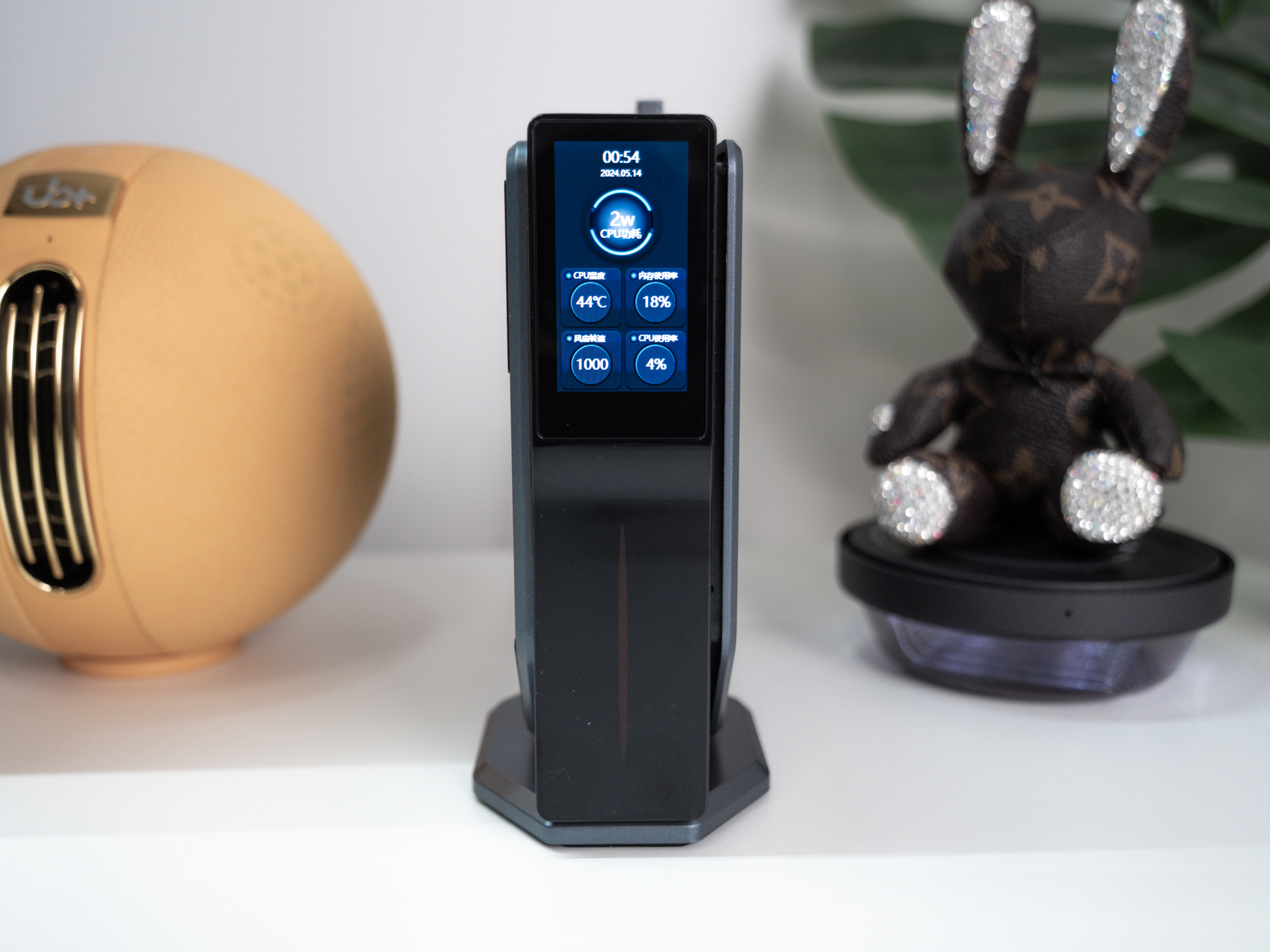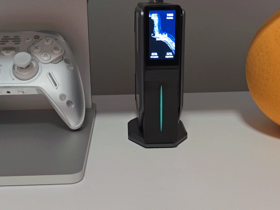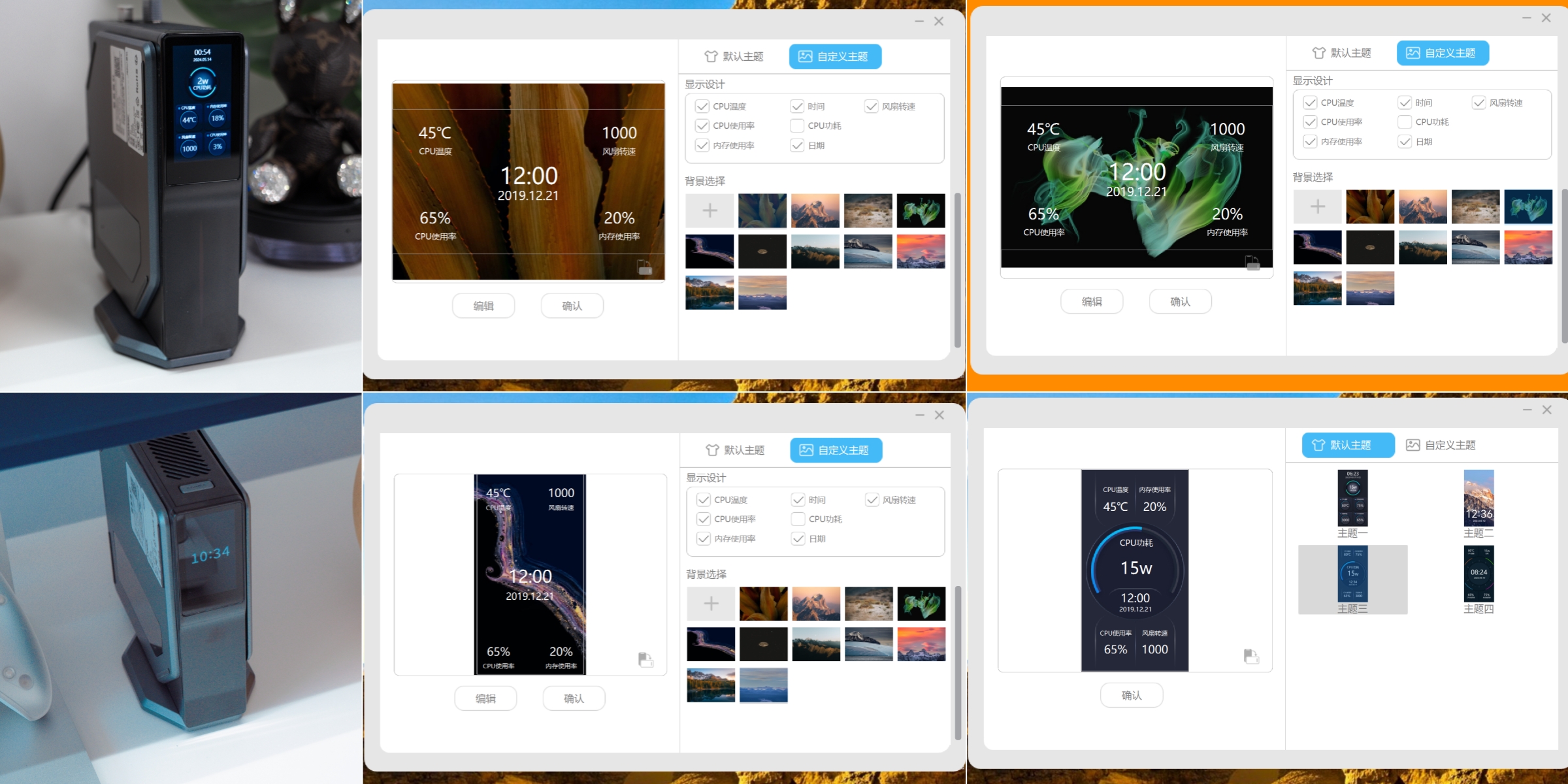 因为主机本身支持竖放/平放两种形态,这块屏幕也支持手动调节显示方向,关机状态下可以显示待机时钟方便看时间,开机状态下支持自定义显示CPU温度、功耗等多项硬件实时参数,并且支持全彩显示和自定义背景图,如果能像某些显卡那样支持动图显示会更有意思。