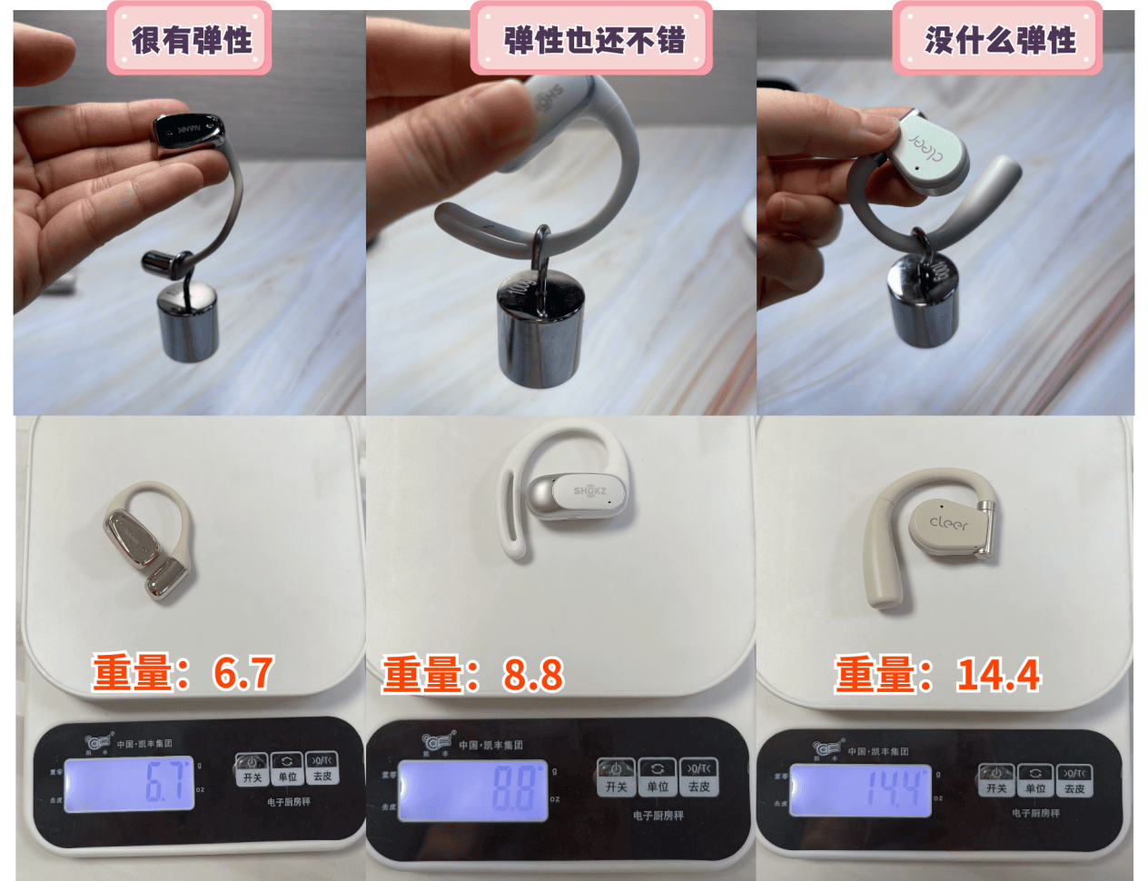 韶音OpenFit Air:单耳重量为8.8g,耳挂纤细度也不错,弹性比OE MIX差一点,在10g的砝码垂坠下能拉伸开1/2的宽度。