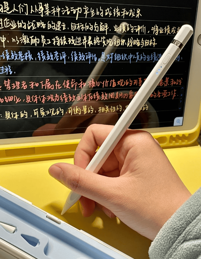 益博思这款电容笔的外观配色整体偏纯白,支持快充还拥有一个应急笔帽,没电时可以直接拔开它插入iPad进行充电,充电仓的下方还有指示灯,能实时显示电量,还做了全屏防误触功能,让我们的手可以自由搭在屏幕上,书写也比较流畅,灵敏度高,不过机身有18g也不支持磁吸iPad,分量感比较明显,长时间书写容易导致手腕发酸。