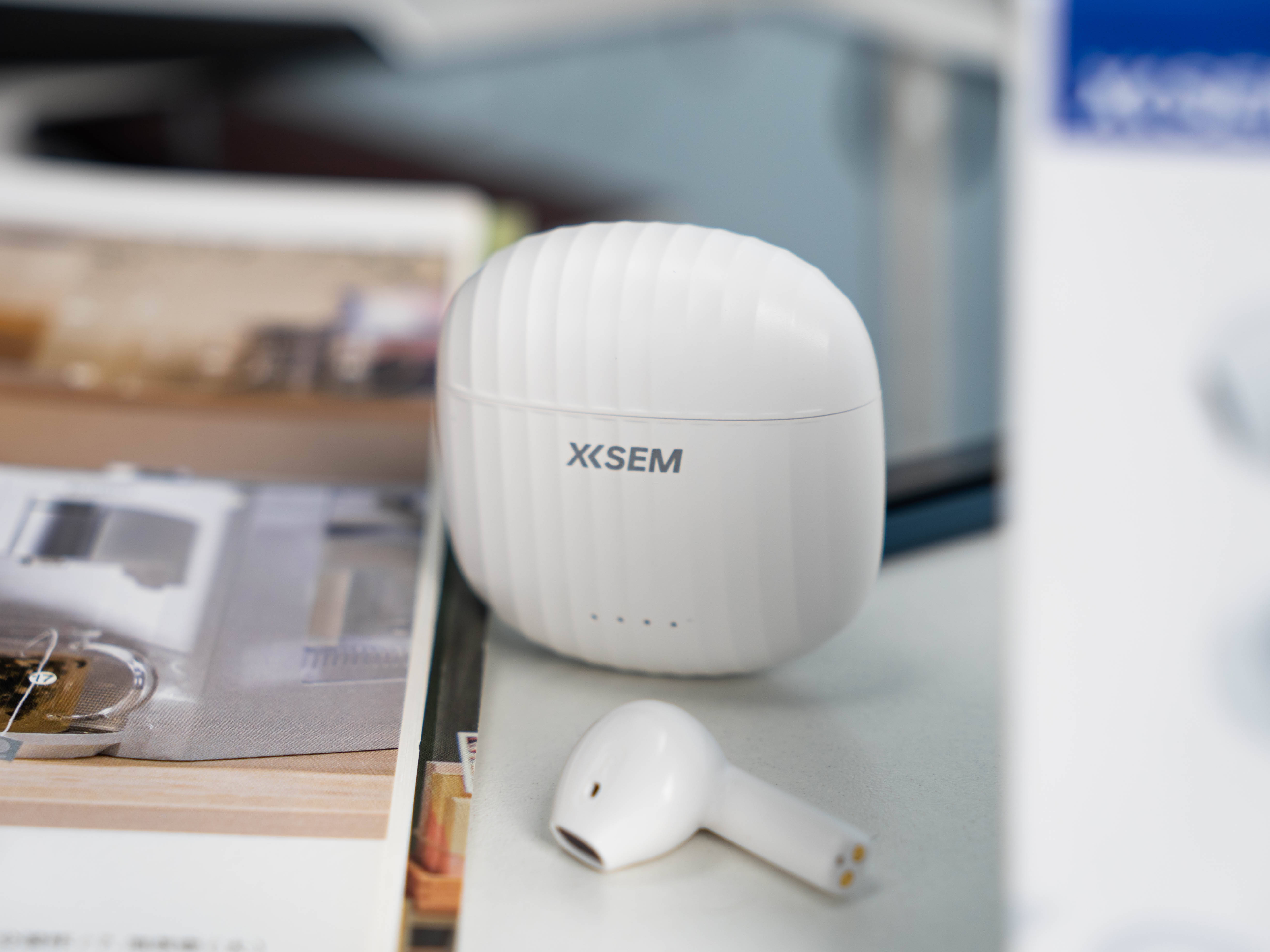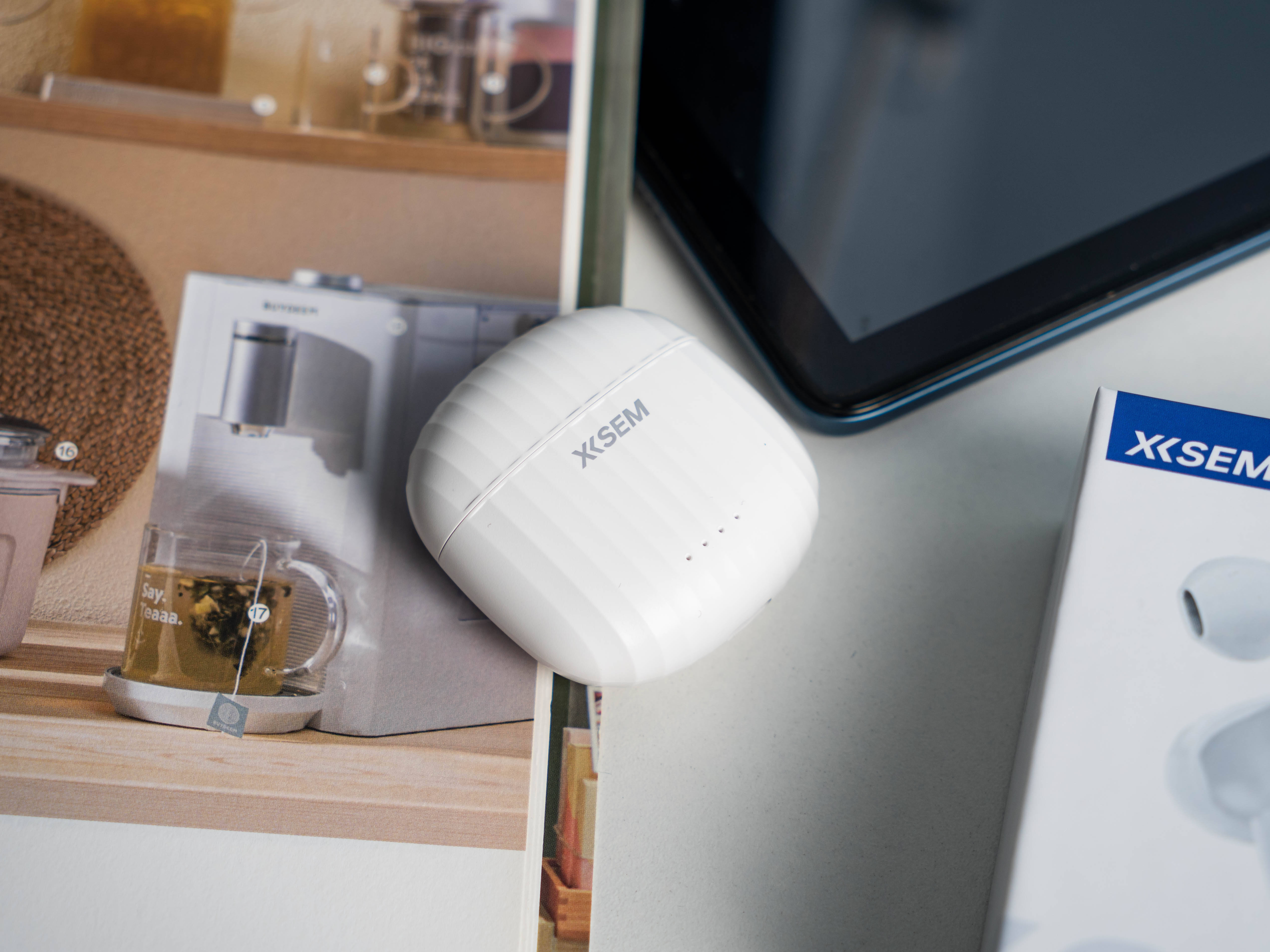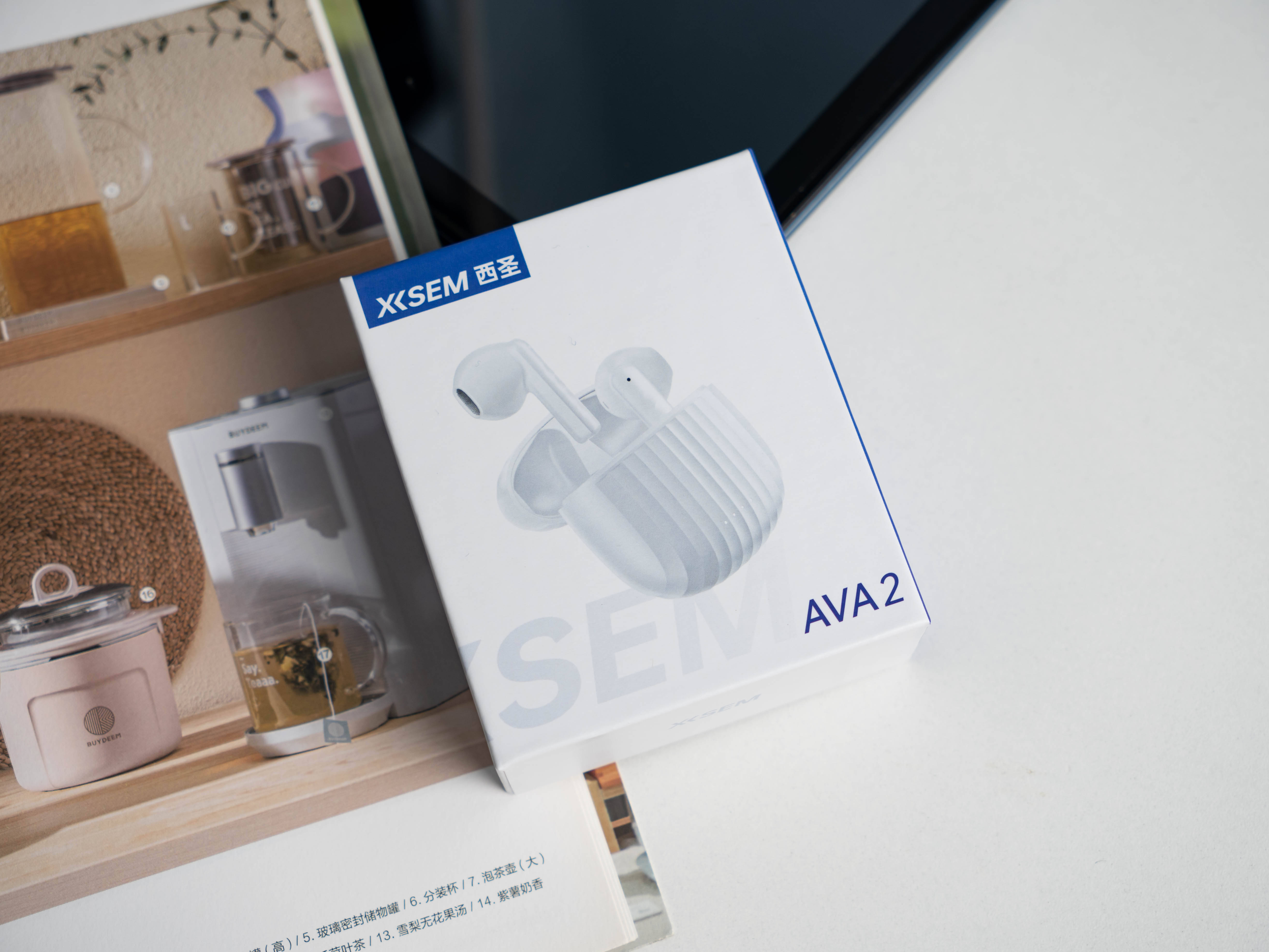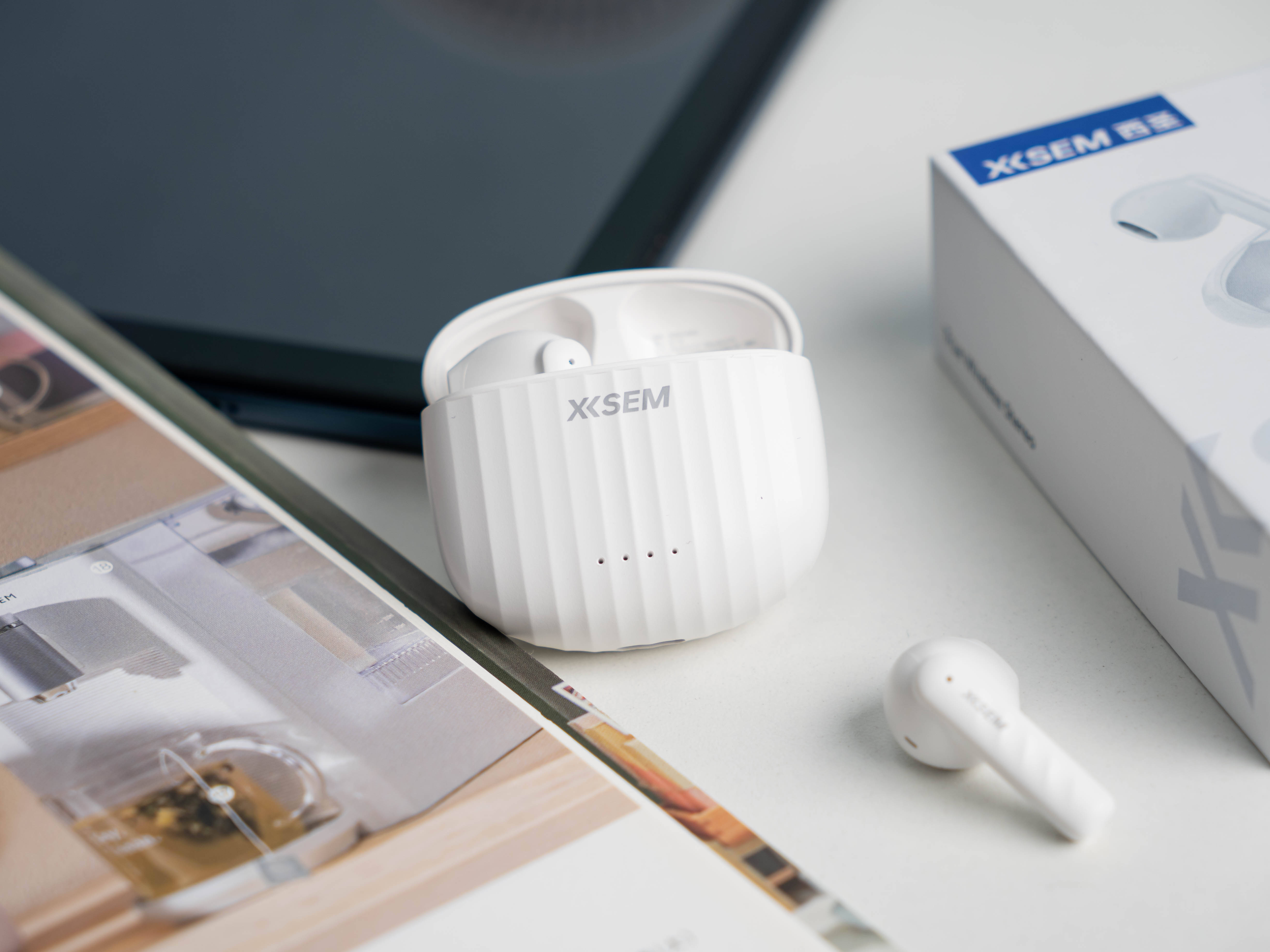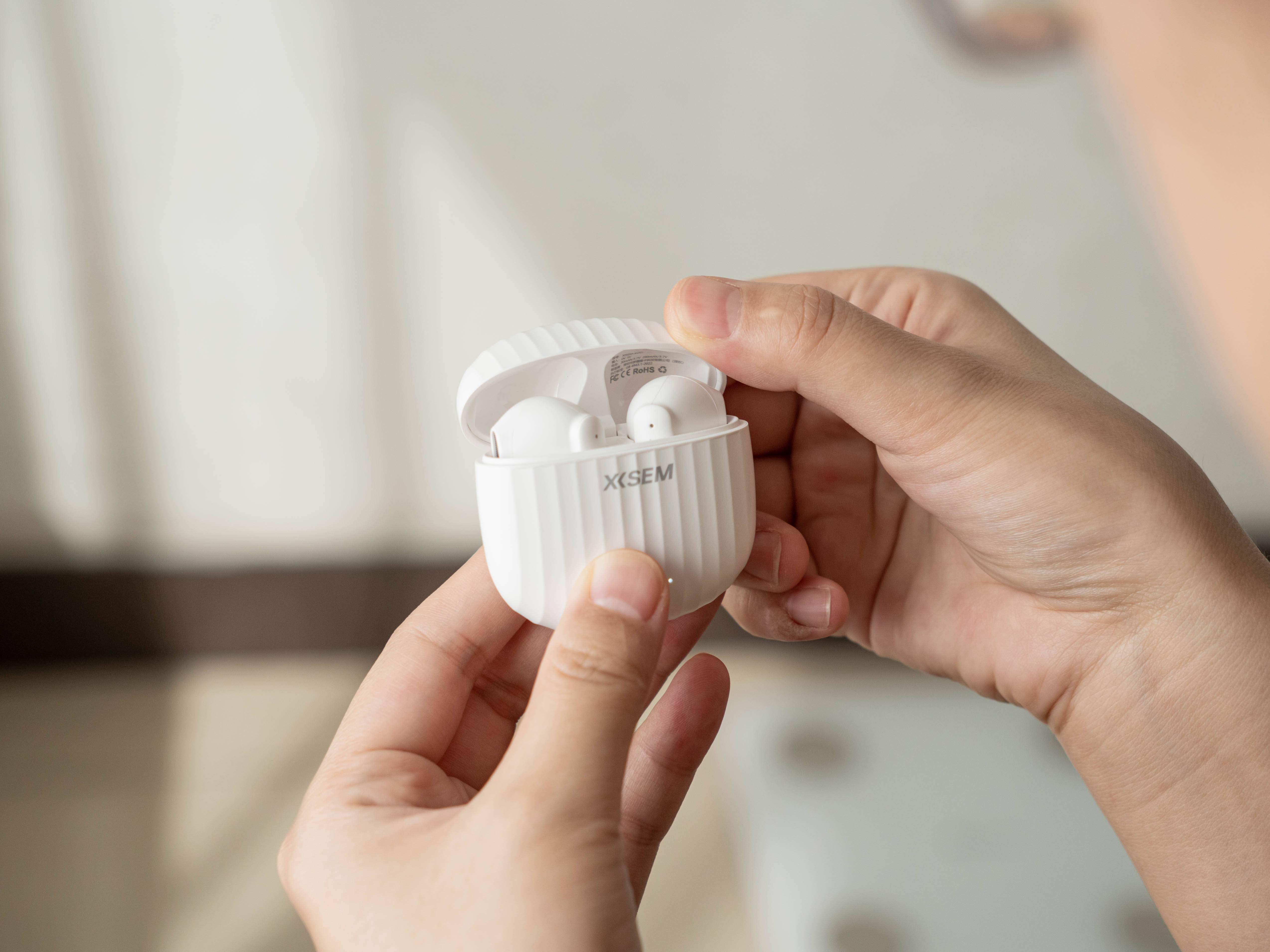 西圣AVA2采用了蓝白色的包装盒,盒子中央的产品渲染图和产品名称AVA2。充电盒的设计类似于贝壳,上面有着条纹造型,设计灵感来源于行李箱条纹,这种设计不仅美观,而且手感防滑舒适。