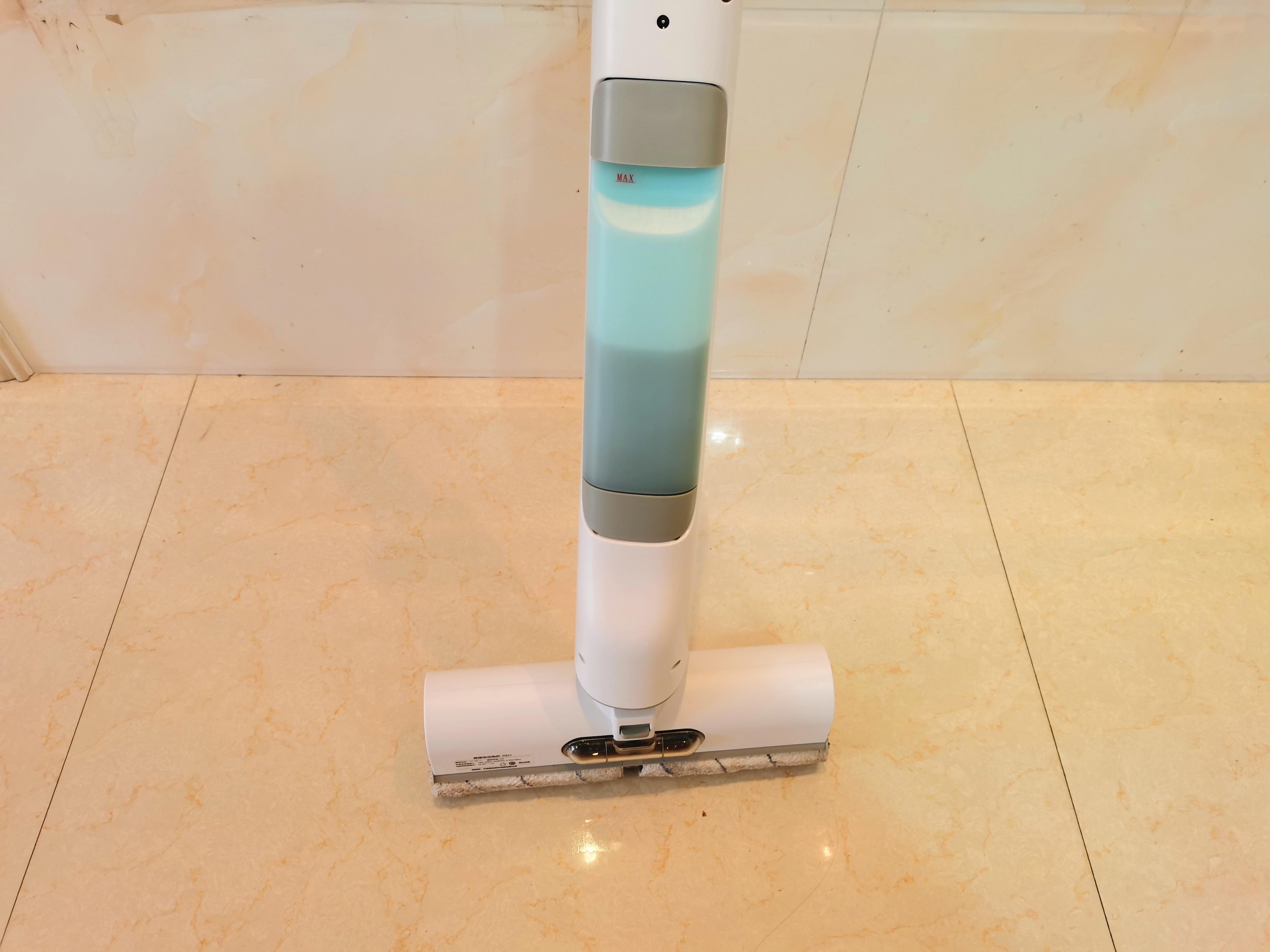 洒哇地咔微湿电动拖把带有自清洁黑科技,水箱加入水后在开启后可均匀的释放清水至每一个区域的拖把头,配合机身的去污条可分离污水与清水,在吸收拖地带来的污水同时还会不断的释放清水到滚筒上,达到自我清洁与湿润拖地的目的,随时保持滚筒刷的清洁拖地。