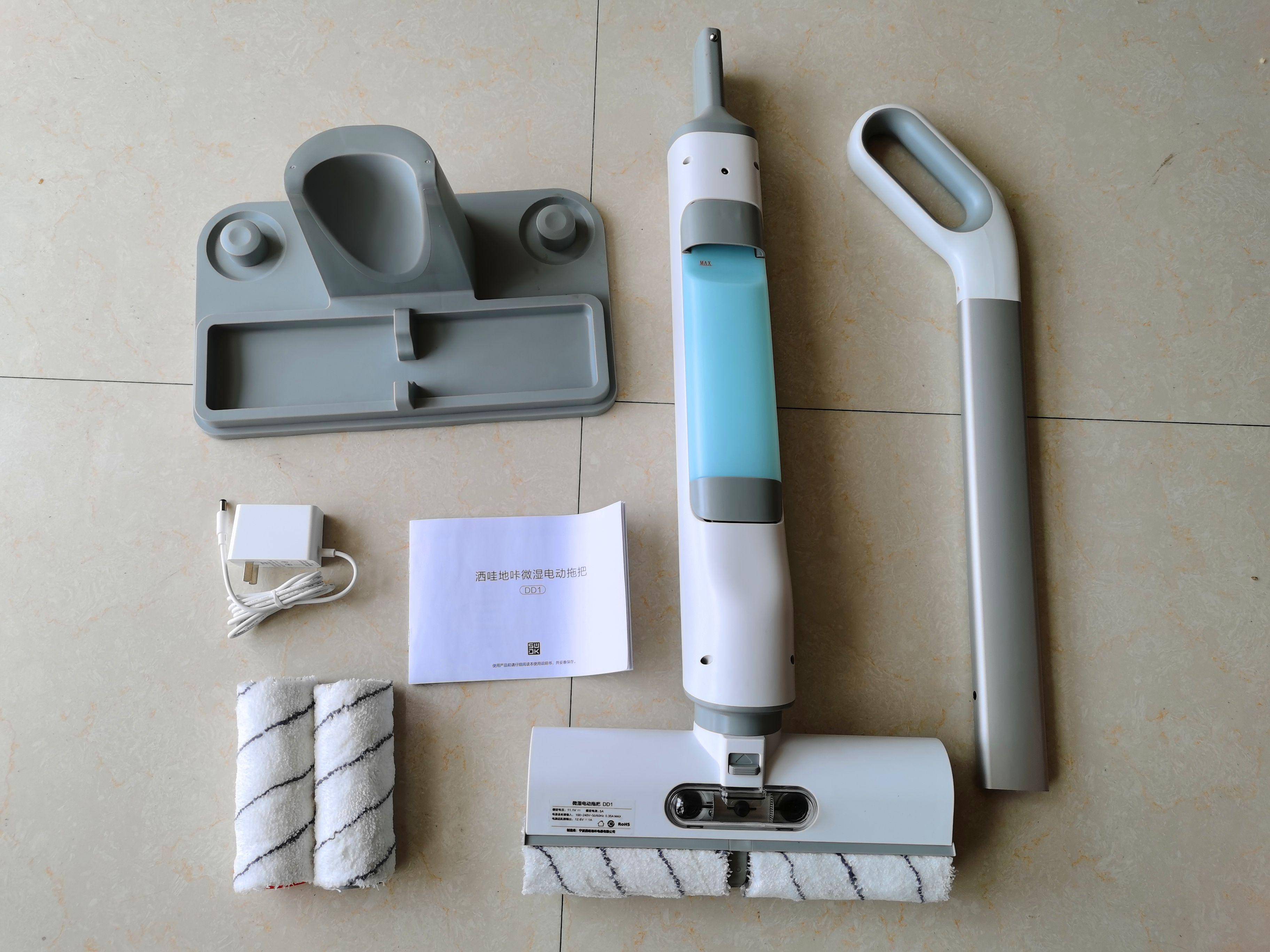 开箱配件有:拖把主机、握把、清洁槽、替换滚筒刷头、操作手册以及充电设备,因为带马达使用,所以此款产品属于电子产品可蓄电使用,充电必不可少。