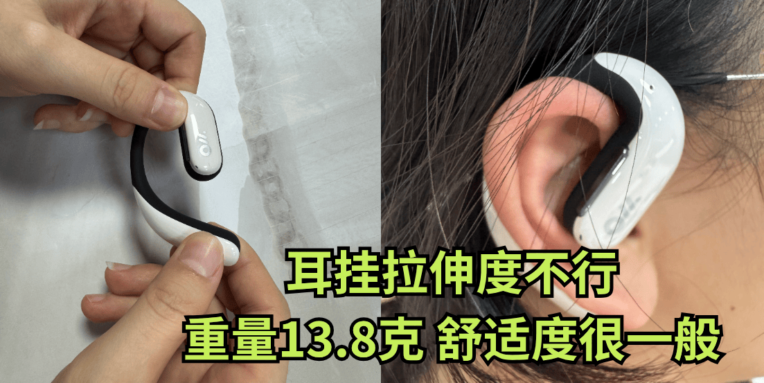Oladance OWS Pro:耳机采用了偏硬的耳挂结构,这一设计结合其一体式的外形特点,使得它对耳廓的适配性较差。在佩戴时,会需要花费更多时间进行调整,来找到合适的佩戴角度。耳机的稳固性表现一般,手感不错,但在舒适性方面有待提升,适合短时间佩戴。