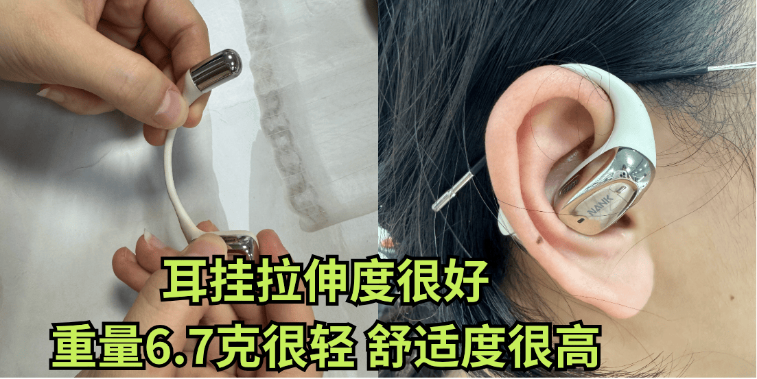南卡OE MIX:最大的优点是仅重6.7g,在三款耳机中最有优势。它采用了56:44的前后轻量化设计,并配备EAA悬浮式耳挂和母婴级亲肤硅胶材质,确保佩戴时既轻便又舒适。经过测试,我在跑步和跳绳一些运动的时候,戴着的舒适度没有任何问题,无需担心脱落或不适。此外,对于戴眼镜的小伙伴来说,其贴肤但不压迫的设计也确保了耳机与耳朵的贴合度,也提升了佩戴的舒适度。
