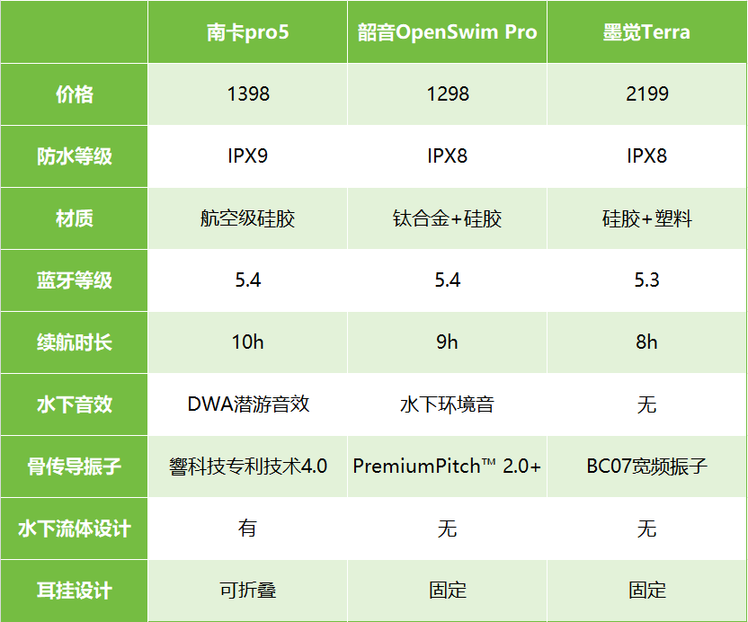 测评下来,这三款游泳耳机各有千秋,不过南卡Pro5的综合配置和性能看确实更加突出,在众多游泳耳机中,可以说Pro5质价比很高,但是在这三款耳机中,也能说性价比很高。但是每个人的需求不同,大家还是要根据自己的需求找最适合自己的游泳耳机!