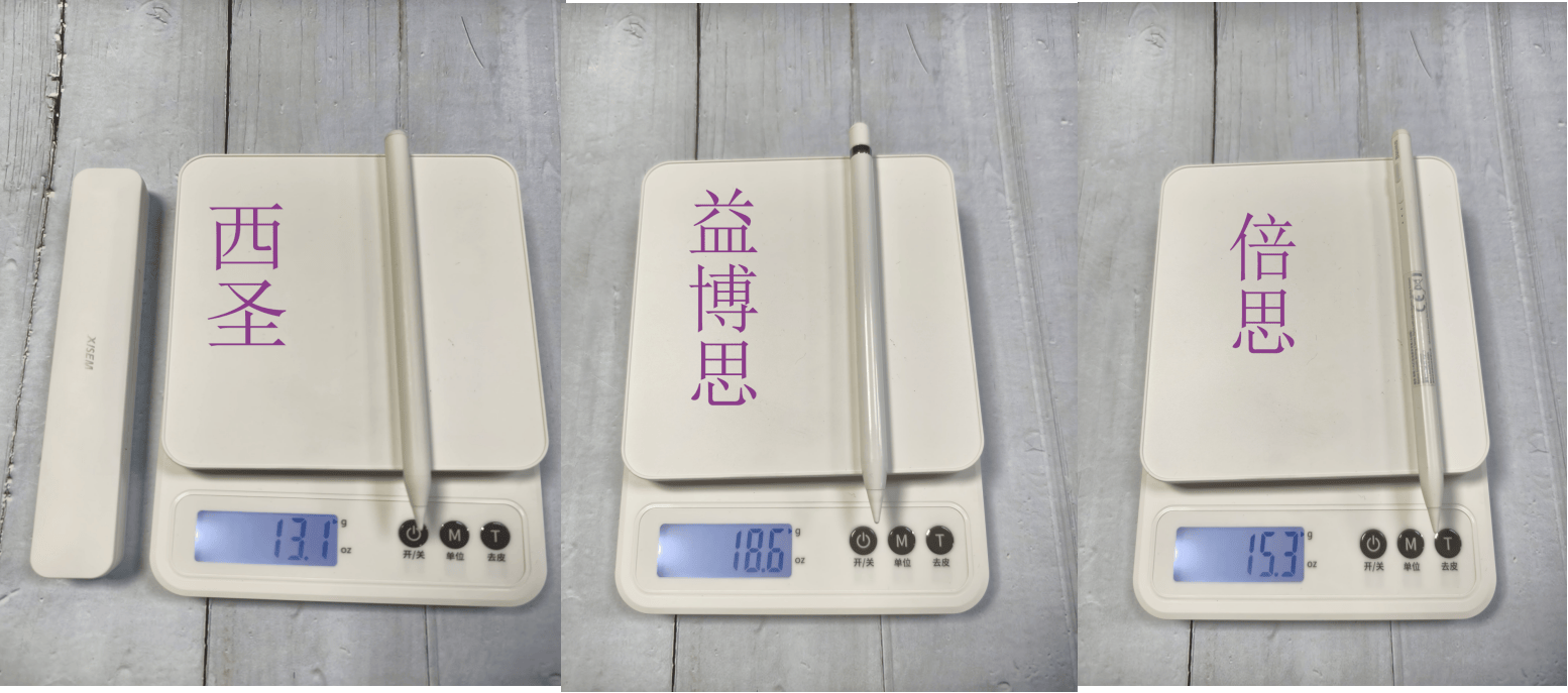 益博思的外表采用了钢琴烤漆,有着不错的触感,但带有一个金属笔帽,使得笔身的重量略重,有18.6克,长时间书写的话手腕会有点儿发酸;倍思电容笔采用一体式设计,笔身线条流畅,重量有15.3克,不是很累手,但整体的舒适度中规中矩。