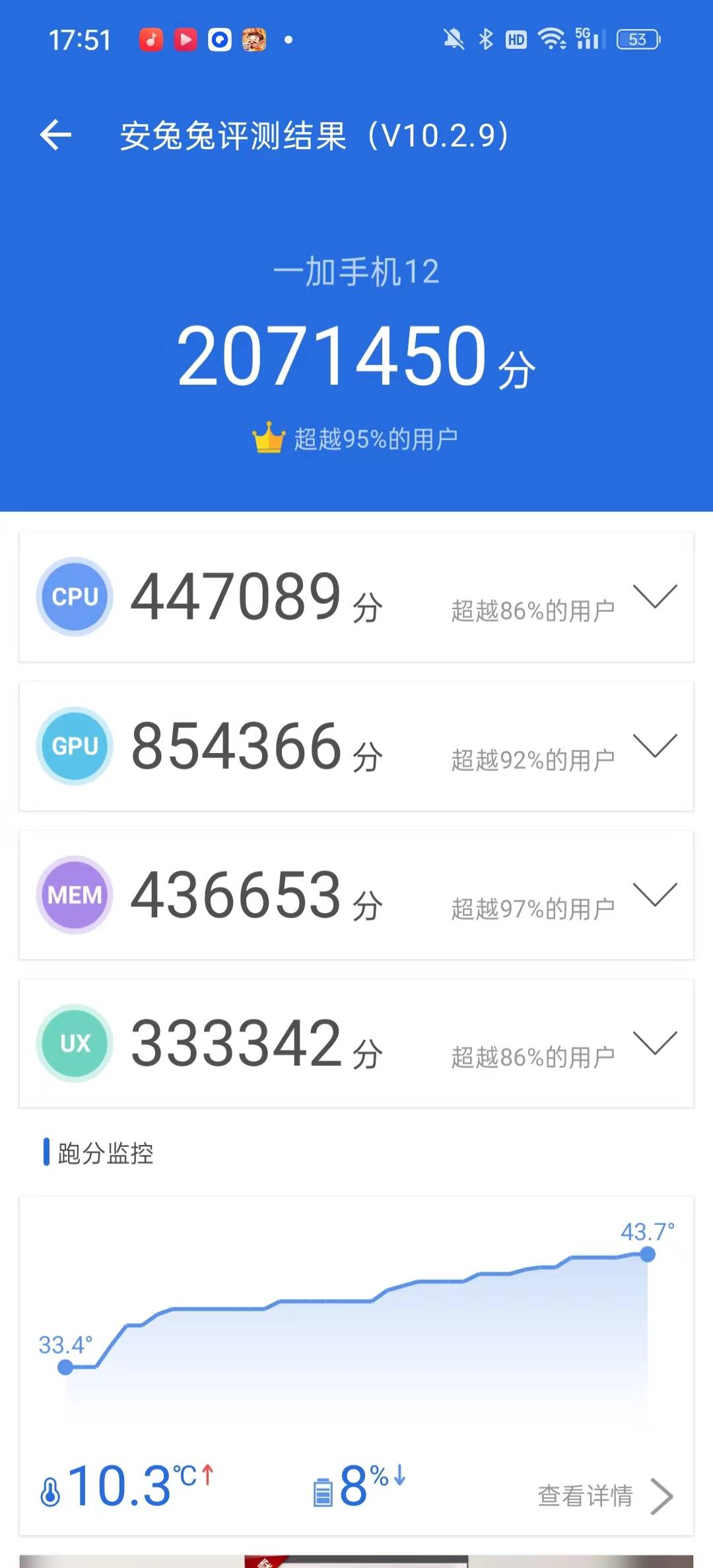 从安兔兔跑分看来,2171450的分数当下顶尖的8Gen3常规水平,放在当前安卓阵营领先水平。关键现在是夏天,在33℃起始温度下依然能跑207万就很嚣张了。