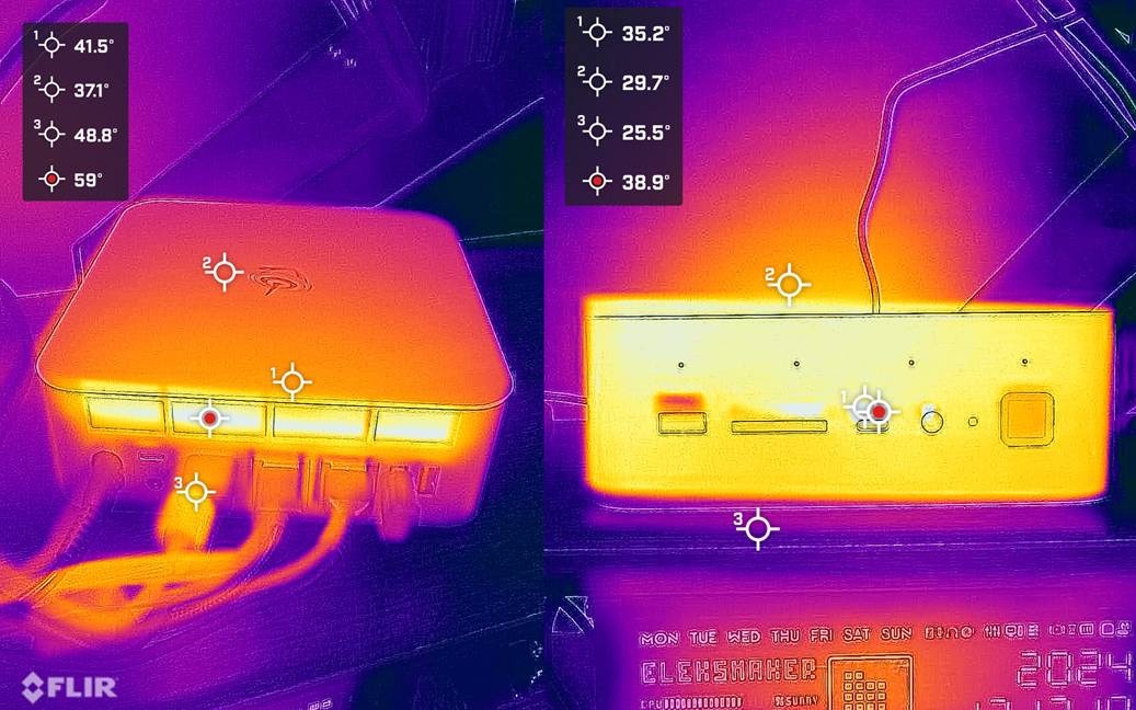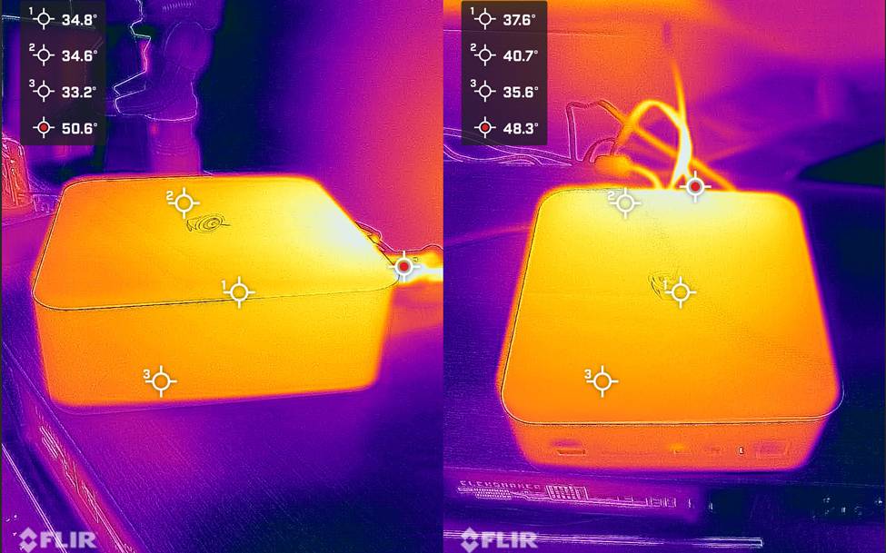 从侧面散热孔和顶部位置来看,侧面温度较高,约 50℃,顶部温度相对较低,靠近散热片的位置温度稍高,约 48℃。整体散热性能良好。这种高度集成化的迷你主机产品,其散热性能极大地考验产品的设计能力。零刻通过大面积散热片和大直径散热风扇,结合优化的风道设计,有效地控制了温度。