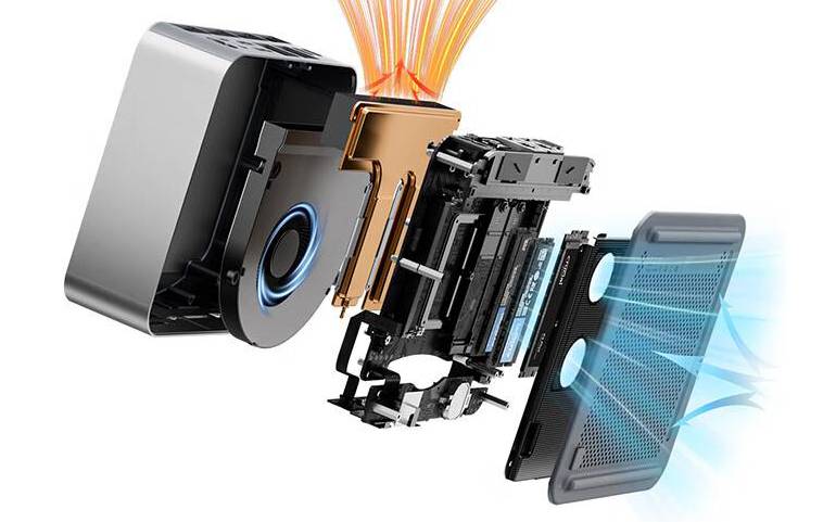 主板拆解过程较为复杂,这里就不再深入。之前已经拆解过 SER8 的散热体系,而作为旗舰产品,零刻 GTi14 的散热体系更加强大。从官方设计图可以看到,零刻 GTi14 采用了散热面积更大的风扇模组和定制的 VC 均热板,以增强散热性能,确保迷你主机长时间运行时的稳定性。目前,只有零刻在迷你主机品牌中采用此技术。