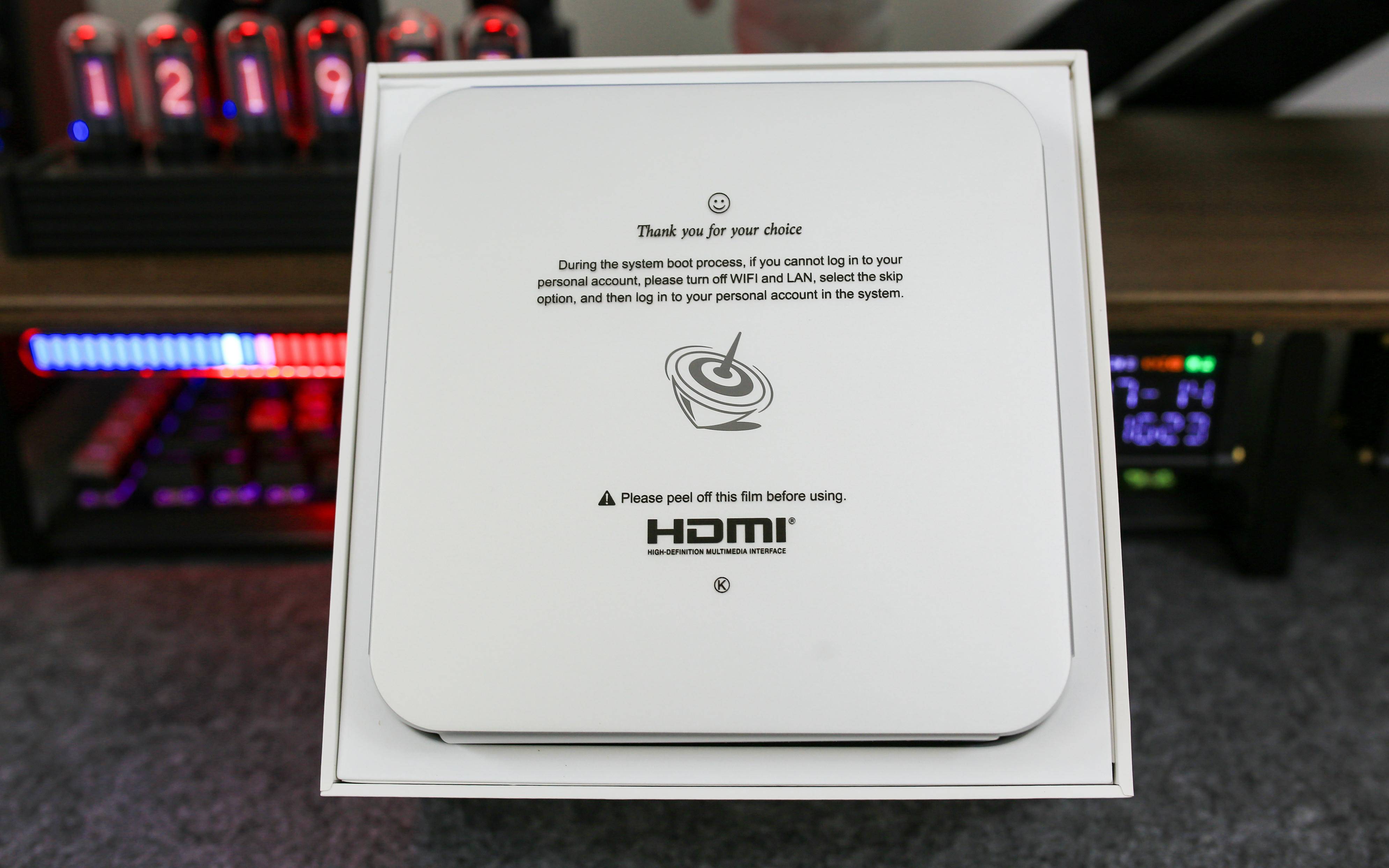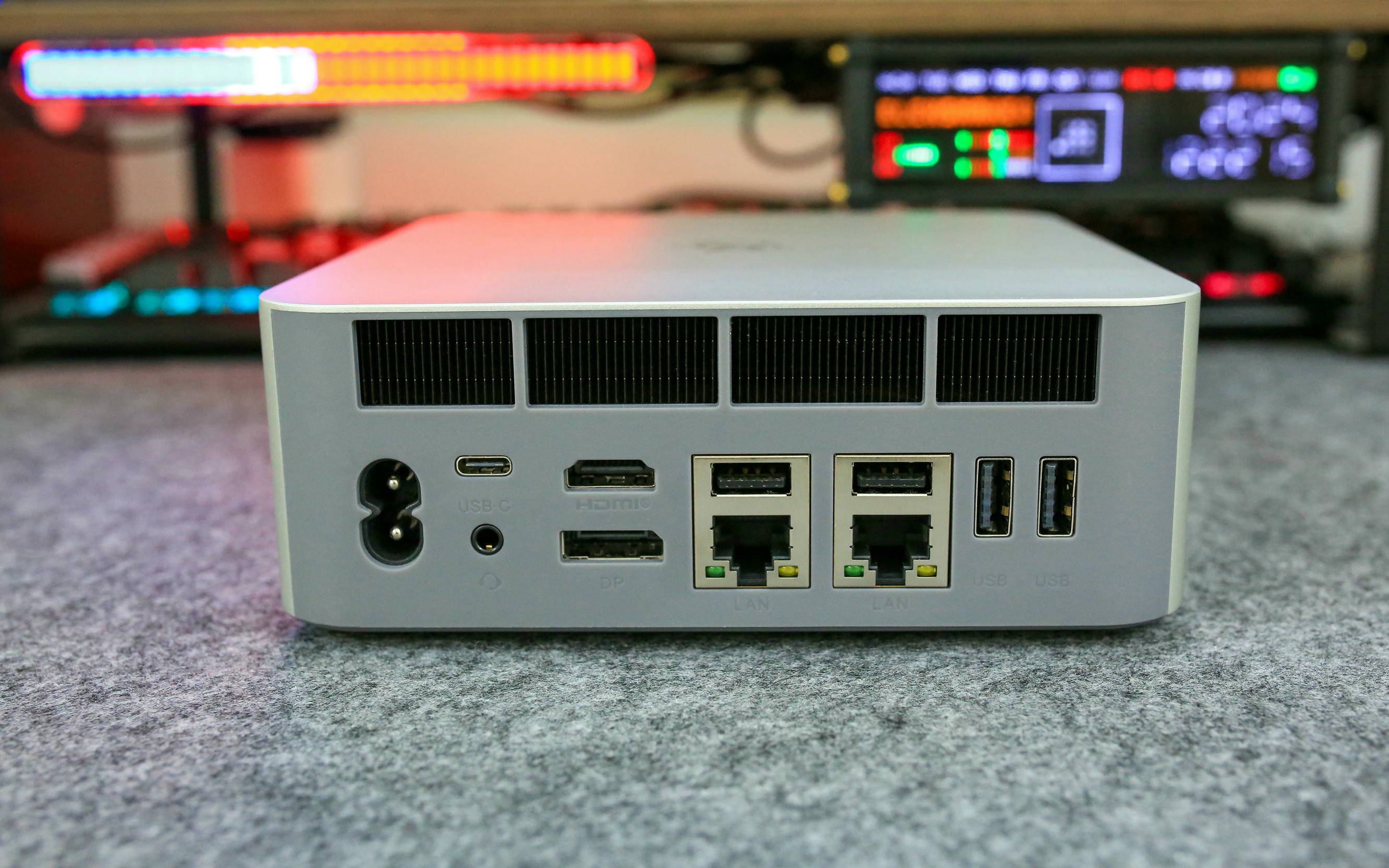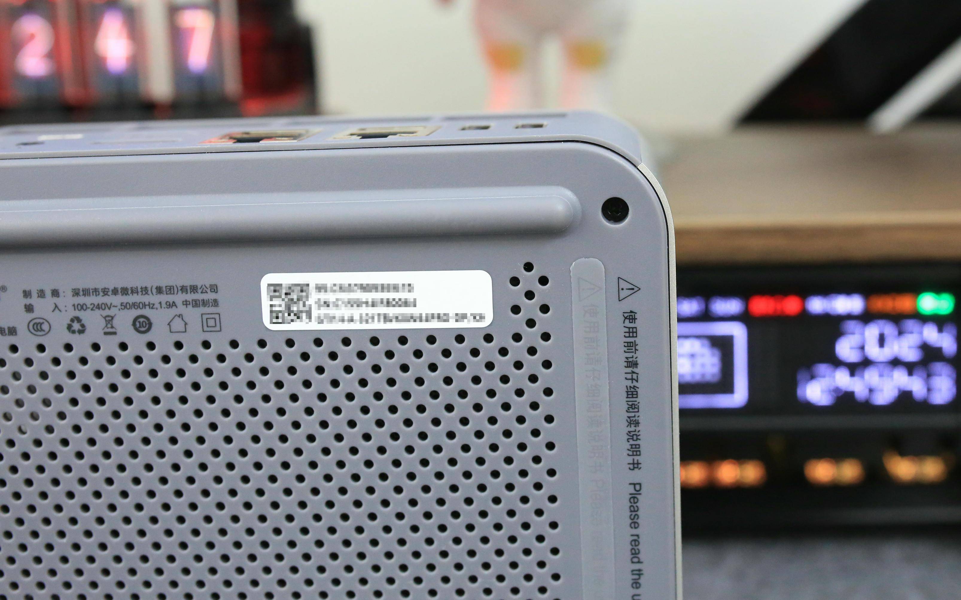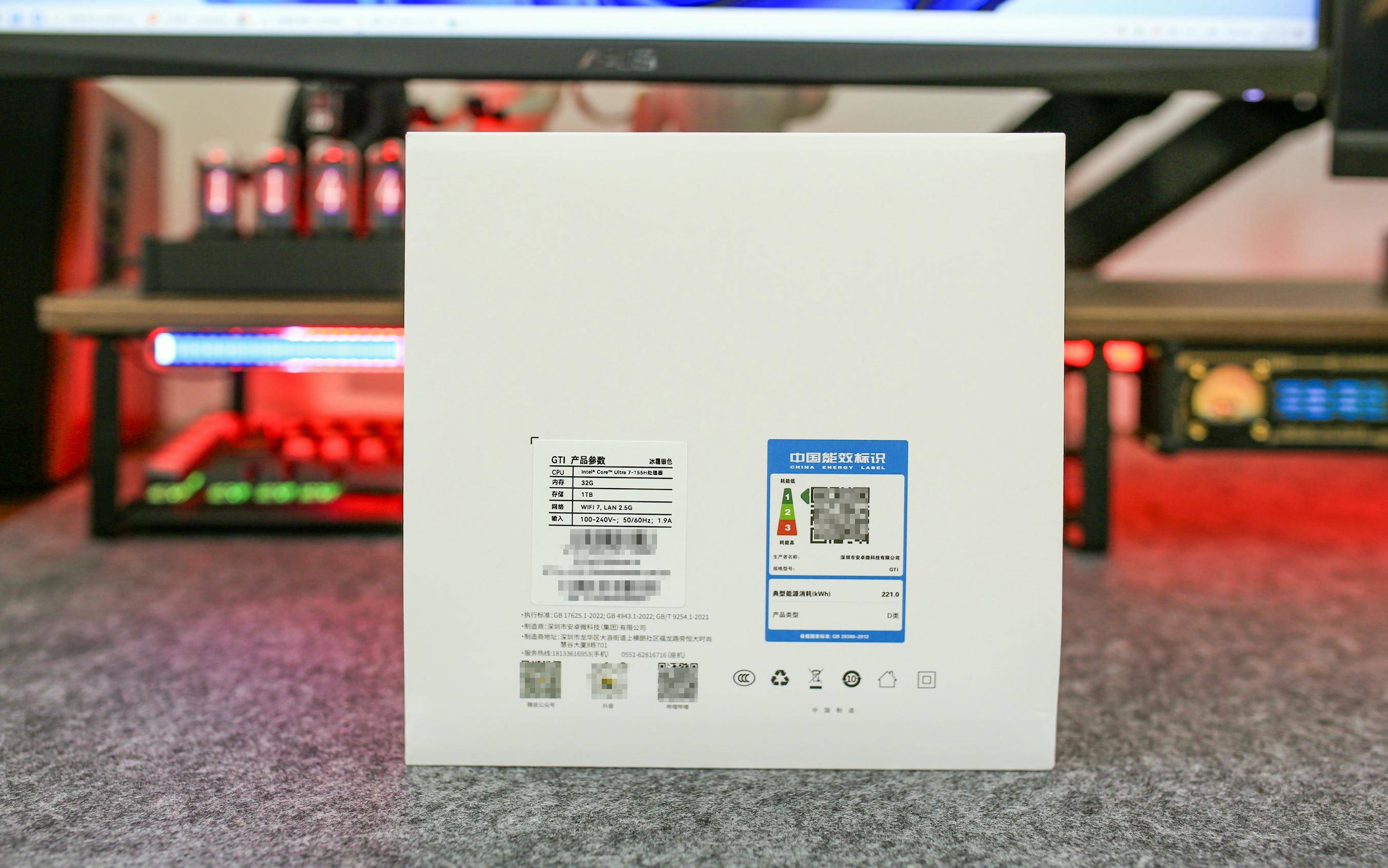 背面是核心配置信息,配备 32GB 内存和 1TB 硬盘,支持最新的 WiFi 7 技术双 2.5G 接口则提供了稳定且高速的有线网络连接。这样的配置完全符合对一台主流 Mini PC 的期待。