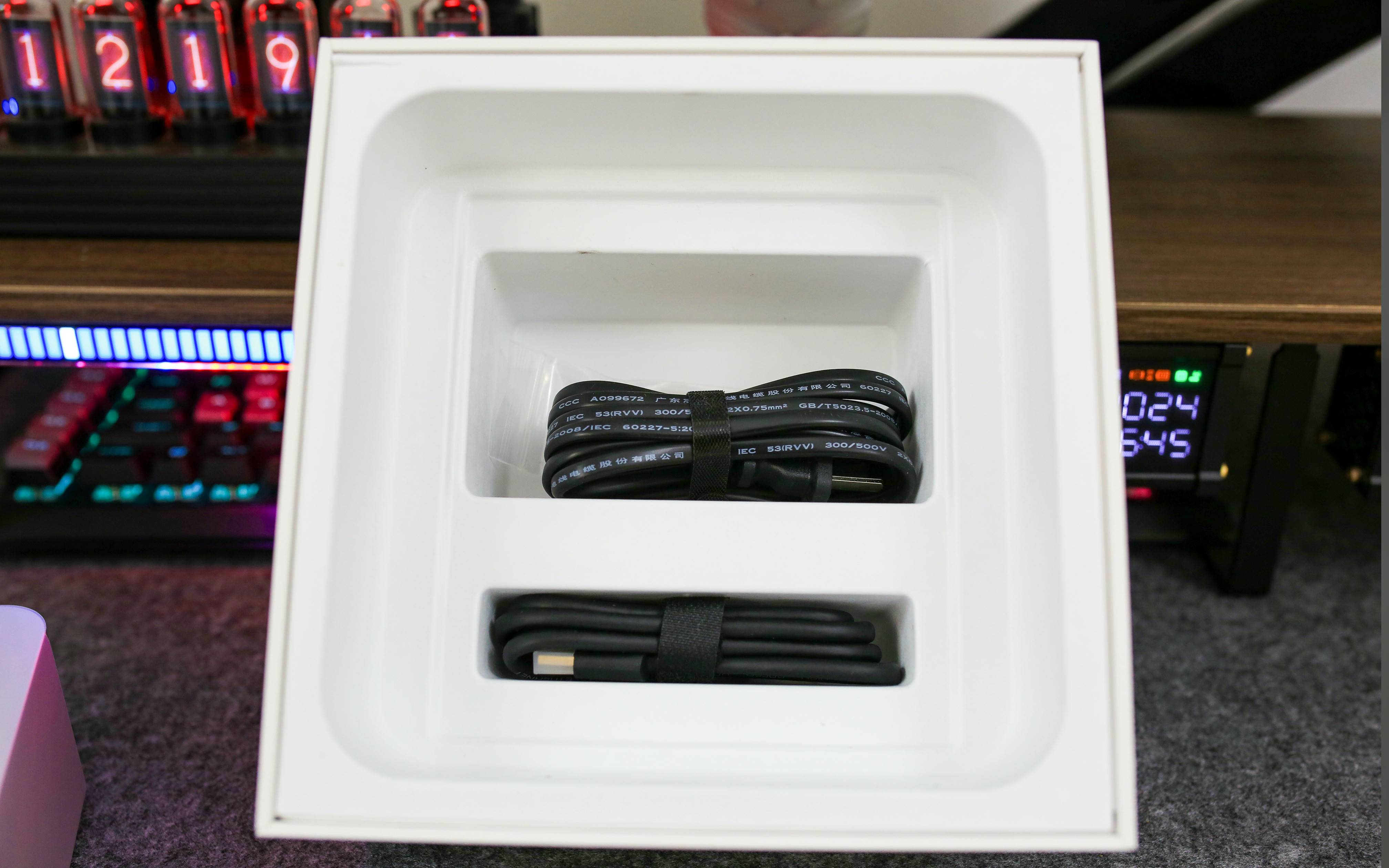来张全家福:零刻 GTi14 的包装盒内含主机、电源适配器、1 根 HDMI 视频线、1 本使用说明书和 1 根电源适配器。这次电源升级非常明显,取消了笨重的外置变压器,改为 AC 电源线接口,内置了 145W 电源模块,仅需一根电源线就能稳定运行。