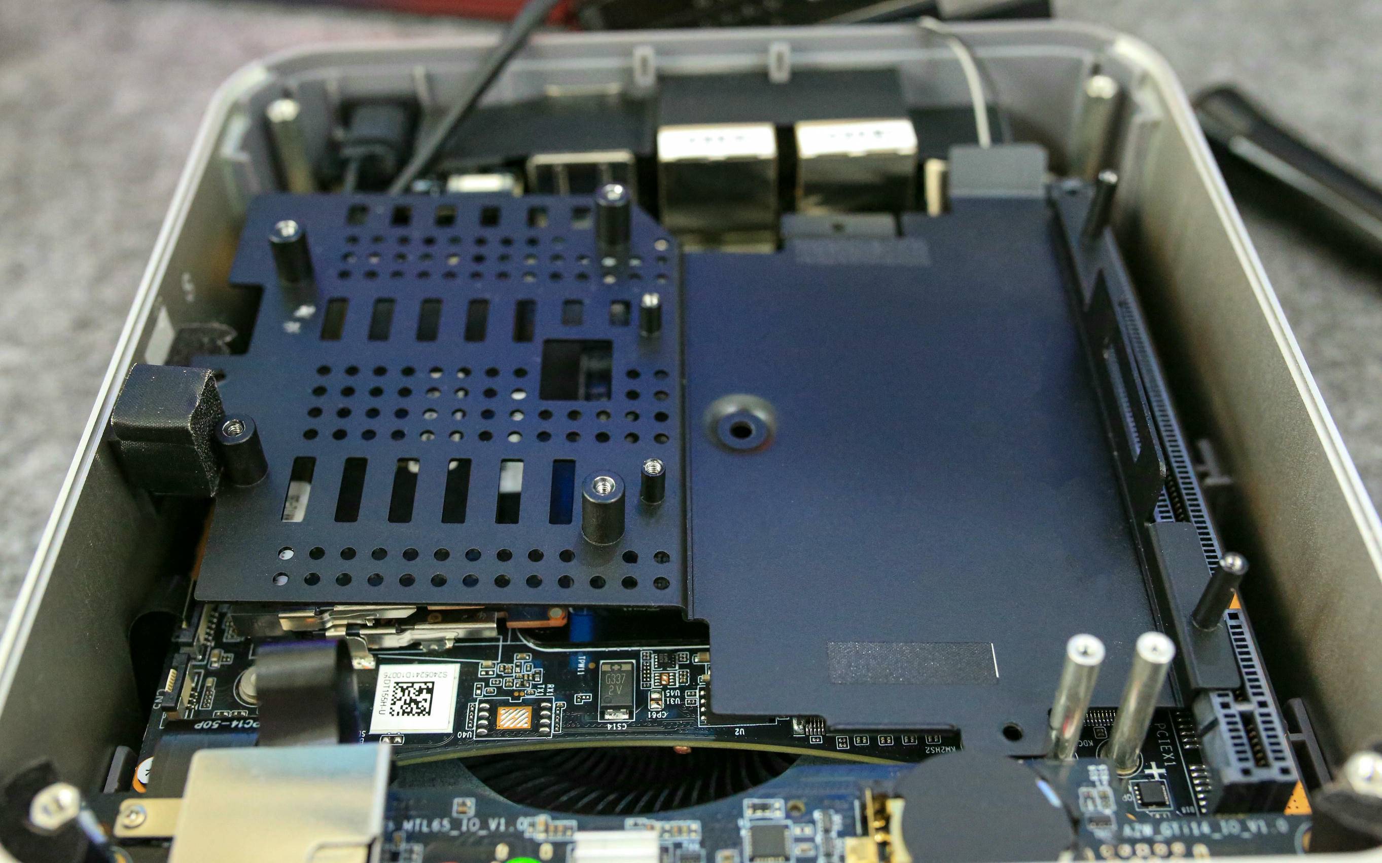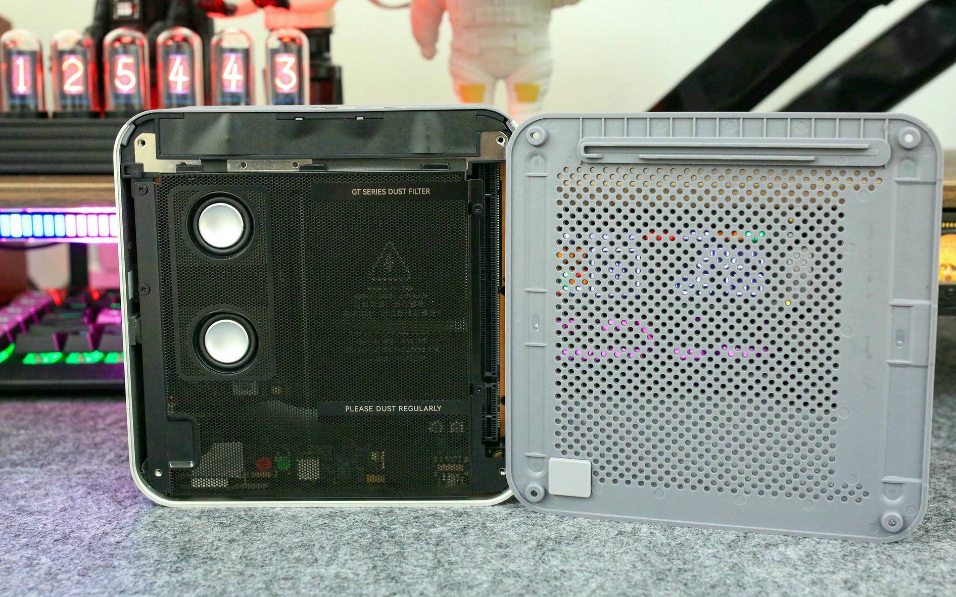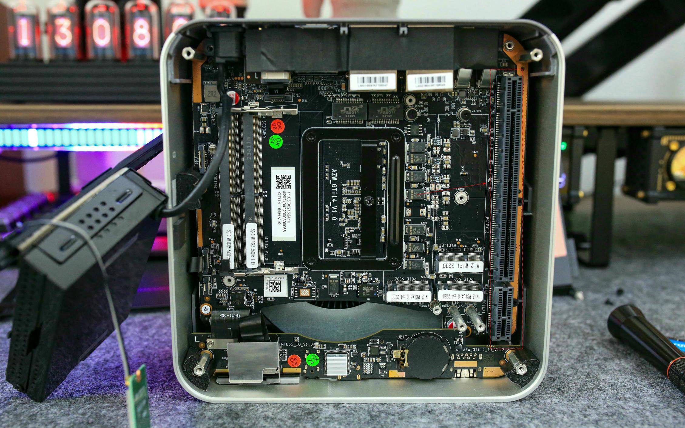 盒子的顶部是这款机器的亮点所在。零刻 GTi14配备标准的 PCIe 显卡插槽,通过专用的扩展坞底座,可以实现真正无损的外接显卡体验。理论上,使用 ITX 机箱的 PCIe 延长线和电源也能实现外接显卡,提供了更高的可玩性。