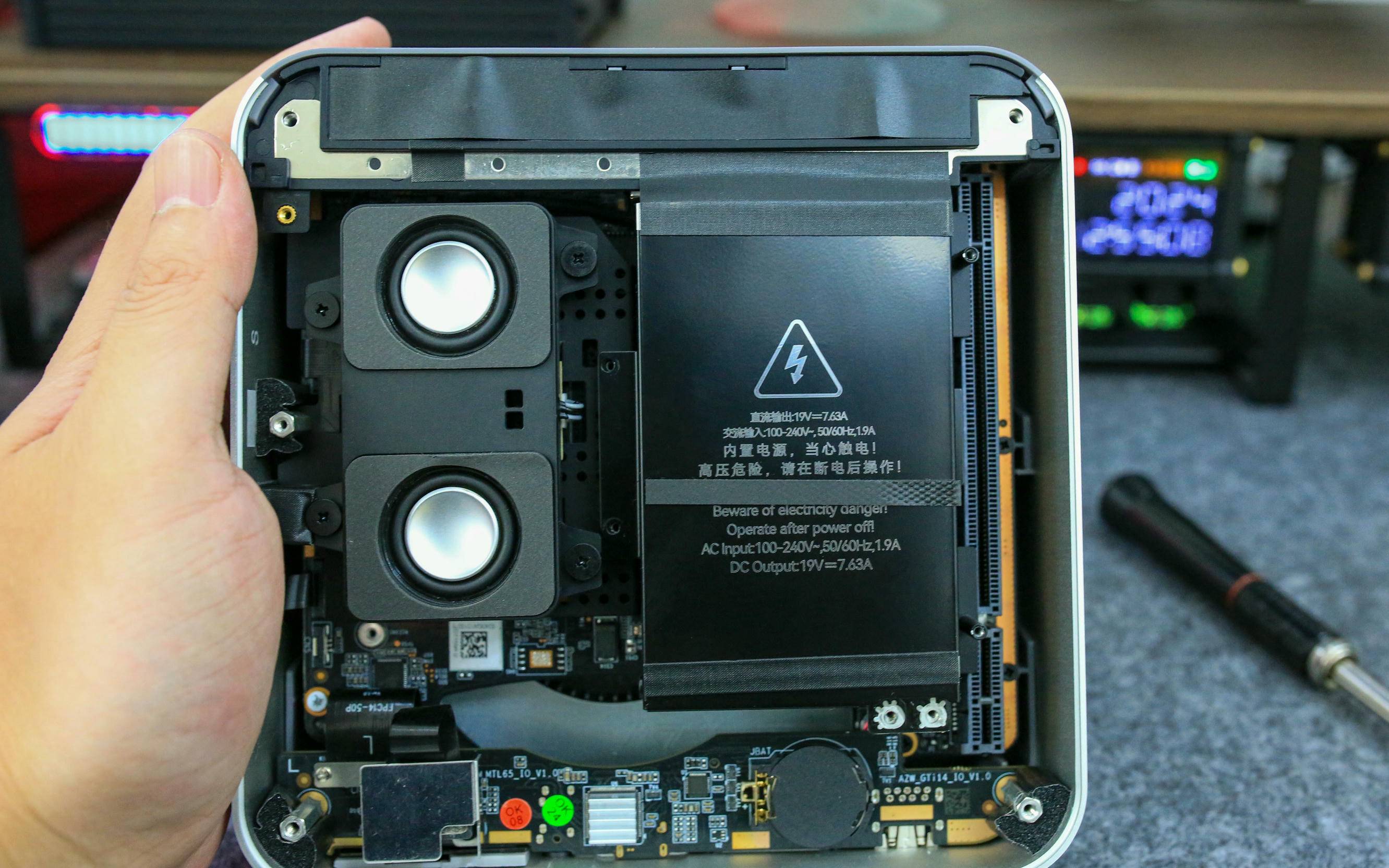 得益于更宽裕的内部空间,零刻 GTi14将 145W 电源、大功率立体双扬声器及 MIC 模块全部整合进机身内部。只需一根∞字电源线即可开机。内置电源模块支持直流 19V 7.63A 输出,最大功率为 145W,模块固定和电极连接均采用螺丝加固,确保了连接的稳定性。