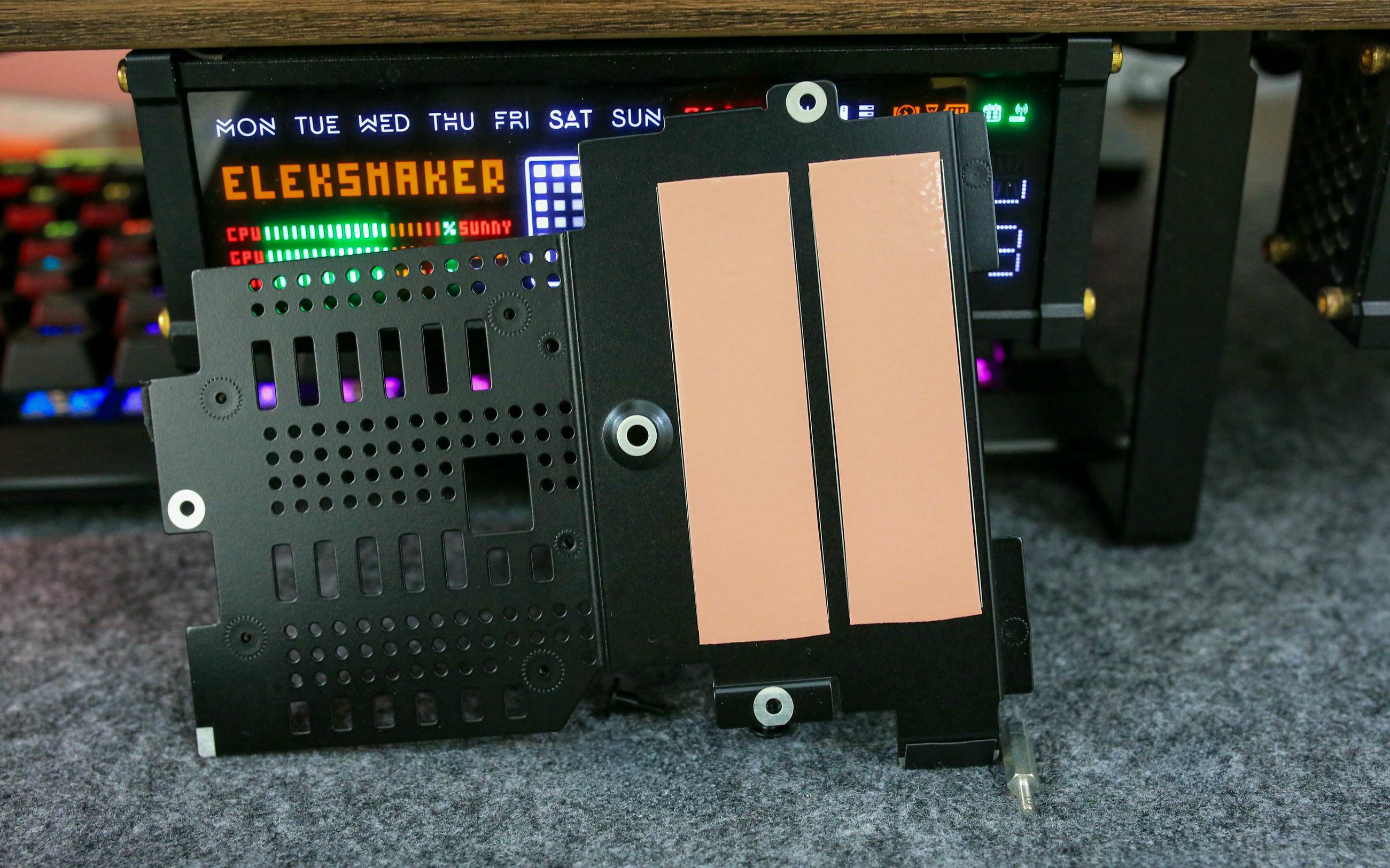 固定板背面有两条散热硅脂用来给镀钛硬盘散热: