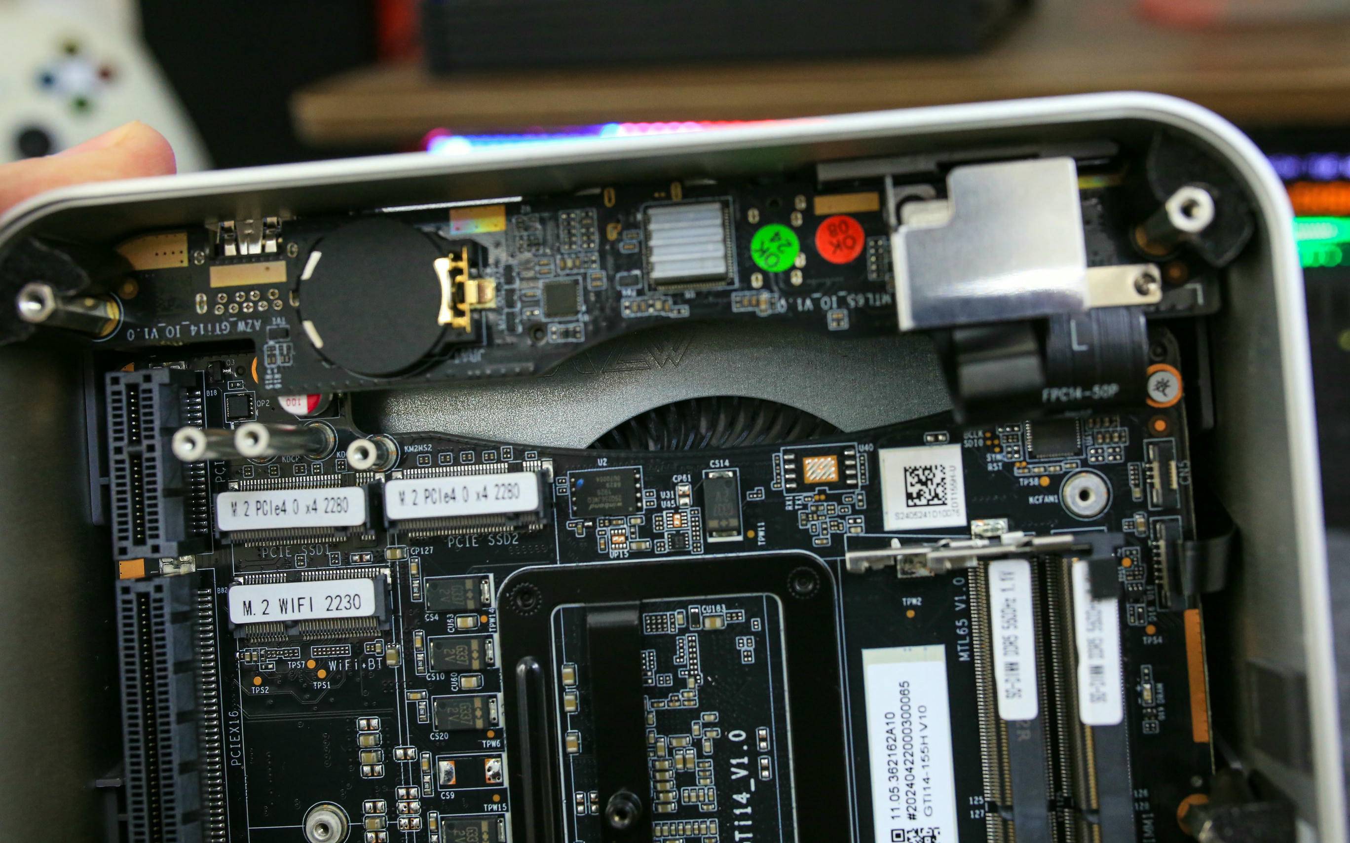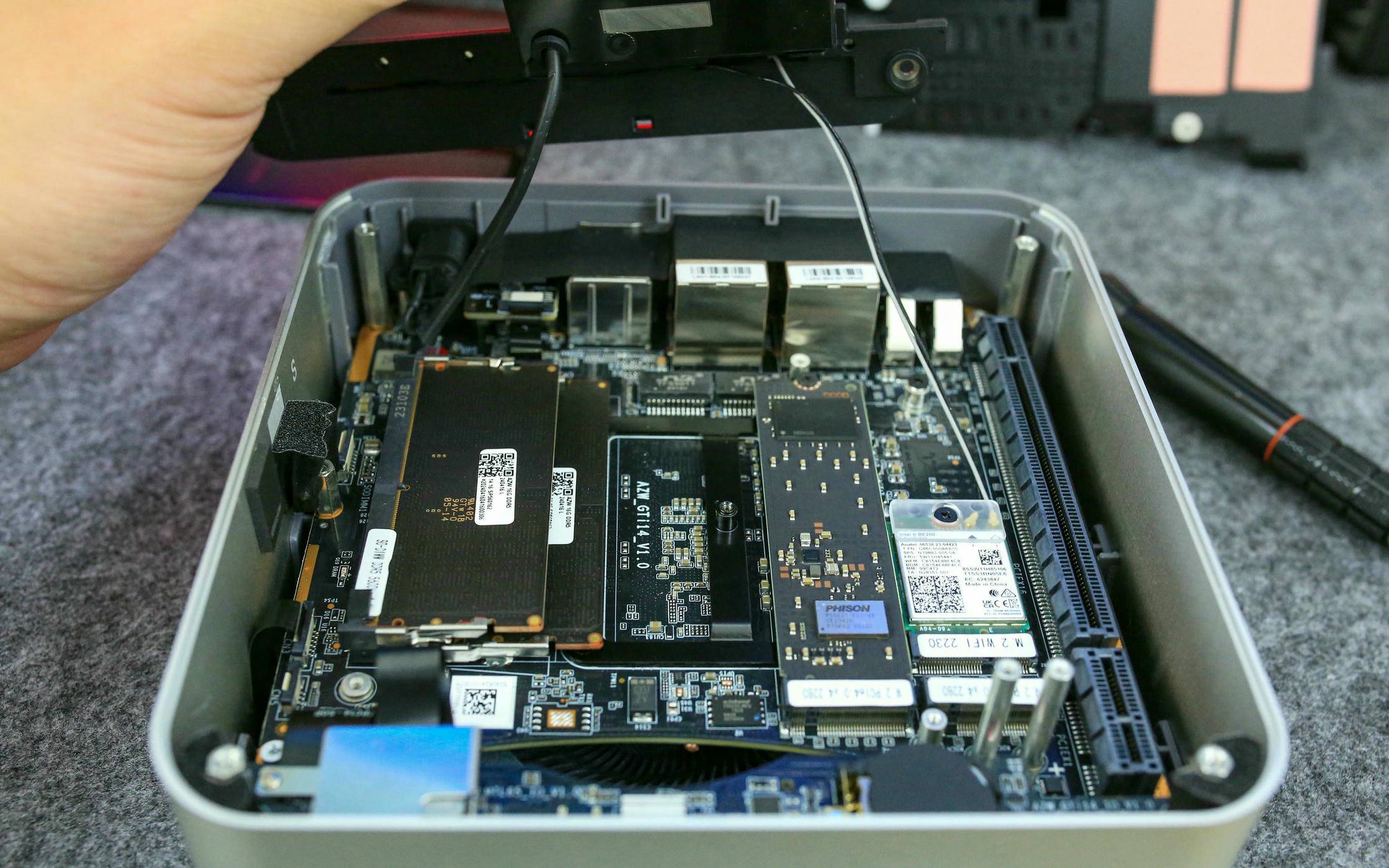 内存条的旁边就是固态硬盘了,零刻 GTi14配置了两个 M.2 NVMe 2280 硬盘位,均支持 PCIe 4.0 SSD ,每个硬盘位均支持最大 4TB 容量。2 个口都装满 4TB 条子的话,最大可以上到 8T 的容量。