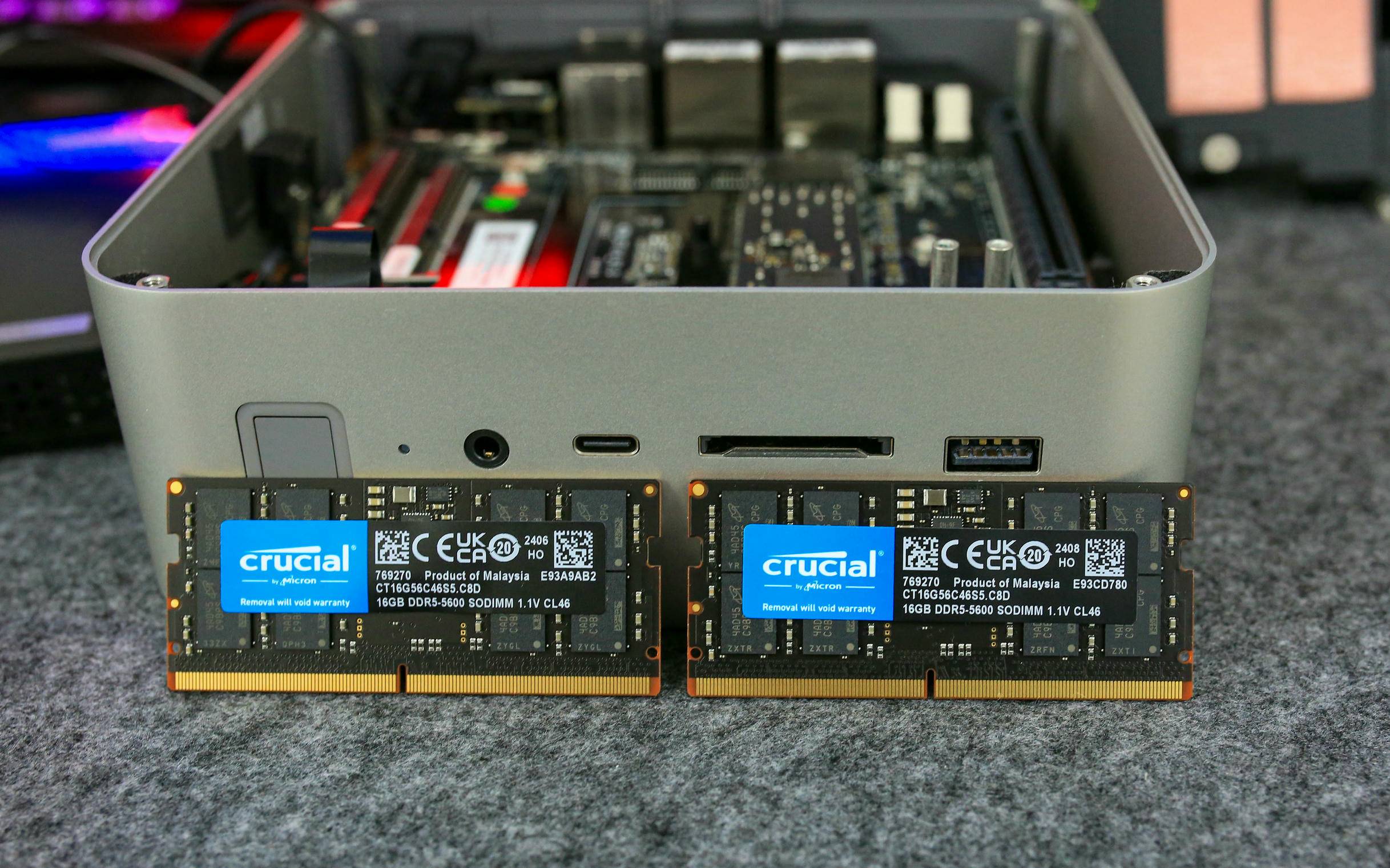 零刻 GTi14内置了双 SO-DIMM 插槽,支持 DDR5 5600MHz,最高可扩展至双通道 256GB。配备了两条英睿达原厂 5600MHz 16GB DDR5 内存条,构成 32GB 双通道配置。该内存经过英特尔的验证,具备出色的兼容性,从颗粒到模组均为原厂设计与制造,质量稳定可靠,在未受到人为损坏的情况下,享有终身质保。