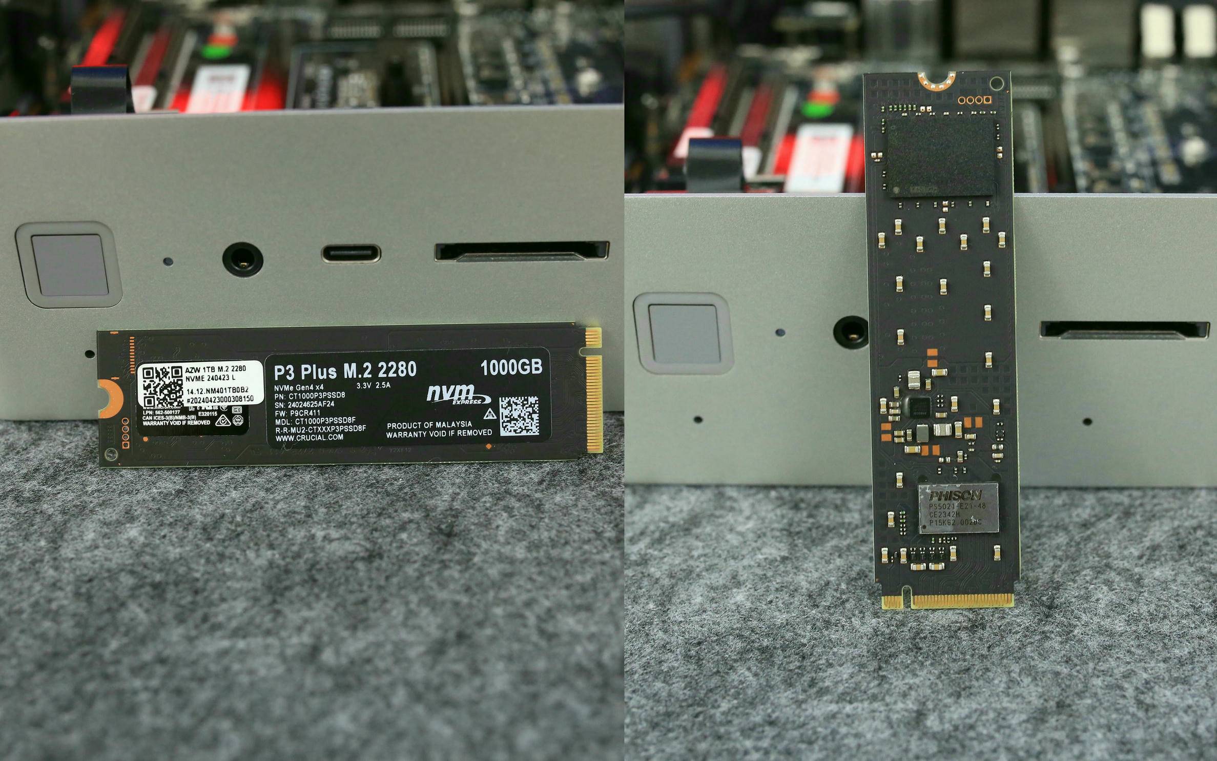 零刻 GTi14出厂已经预装了一块来自英睿达的2280 尺寸 M.2 NVMe 固态硬盘,采用PHISON群联主控,容量为 1TB,M.2 接口同时支持 NVMe 和 SATA3 双协议,最大可扩展至8TB。