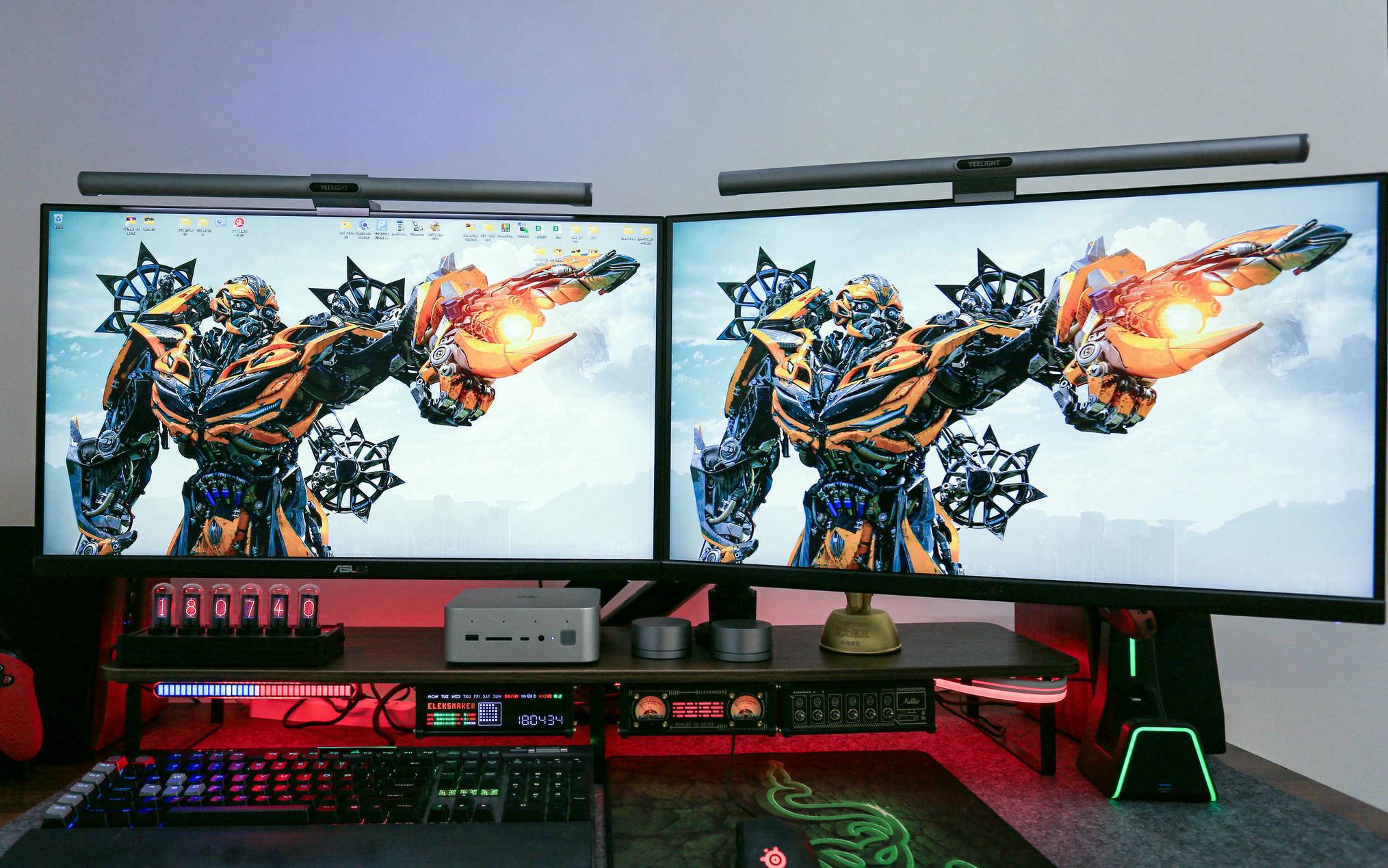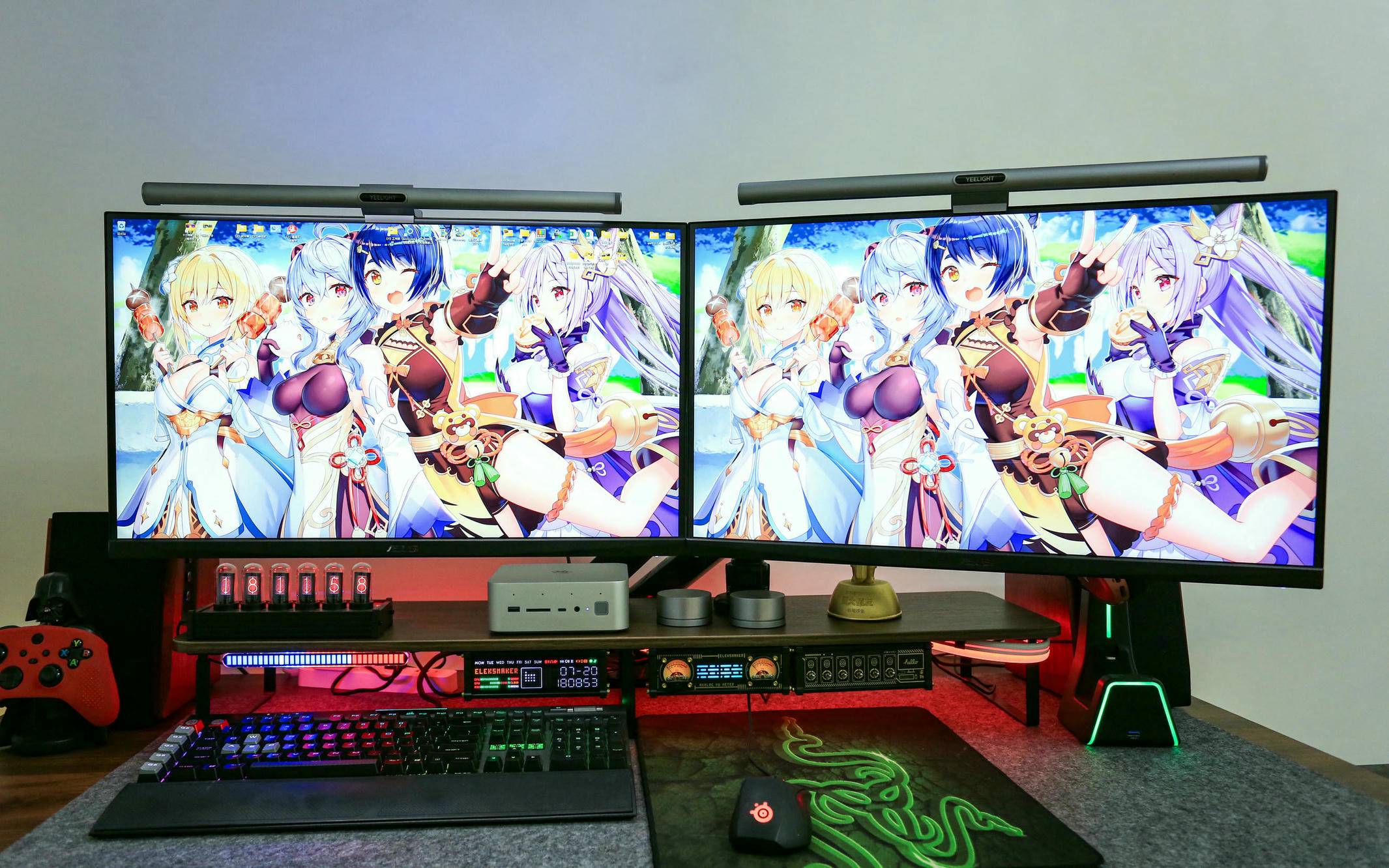 将零刻 GTi14 放置于桌面,桌面显得非常简洁。此外,零刻 GTi14 支持3屏共显功能,允许用户同时连接并使用3台显示器,在进行多窗口操作、数据对比或同时查看不同内容时特别有用,楼主一般喜欢用两台屏幕共显,虽然有个黑边,但是自由度高一点。整体设计使得这款迷你主机不仅功能强大,而且非常适合需要高效、多任务处理的办公环境。