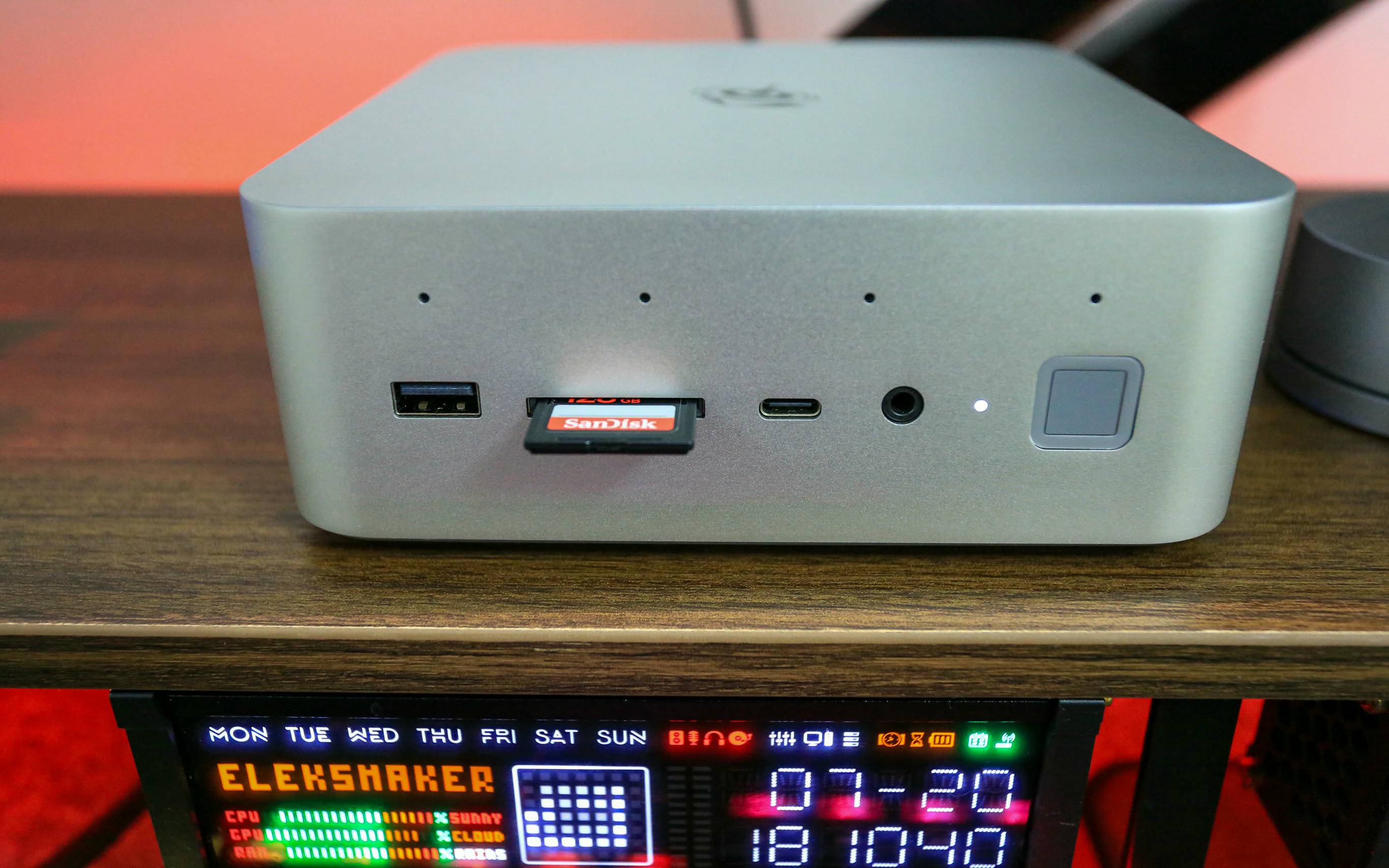 零刻 GTi14前面板增加了 360 度全向降噪阵列列麦克风,并增加了 SD 卡槽,右侧安置的方形电源按键集成了指纹识别功能。接口比市面上大多数迷你主机都要丰富,正面从左到右分别为:一个 USB3.2(10Gbps)接口、一个 SD 卡槽、一个 USB-C(10Gbps)接口、一个 3.5mm 耳机接口、一个电源指示灯和一个附带指纹识别的电源按键。