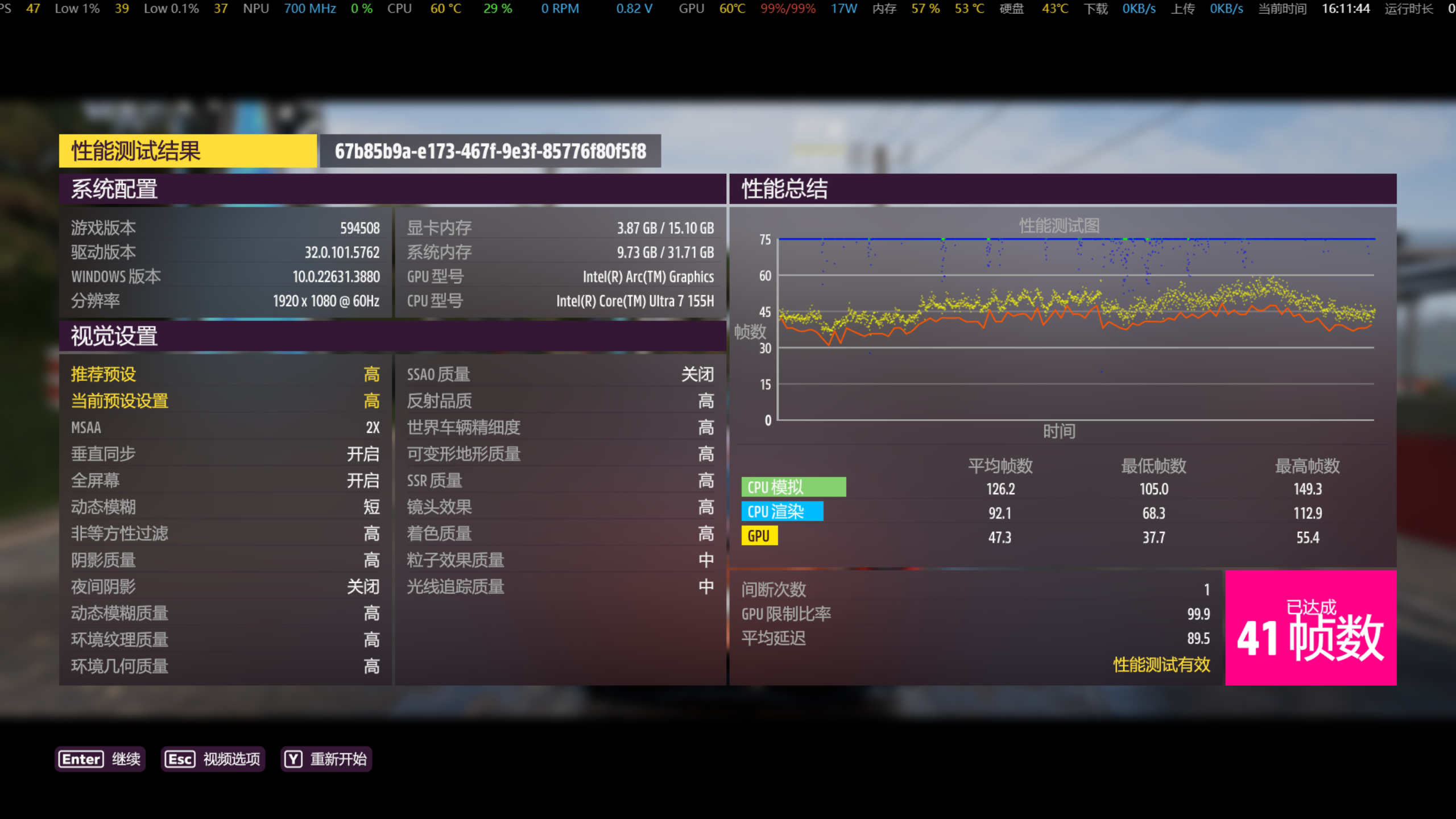 游戏的视觉效果依然出色,对于一款赛车游戏,Arc Graphics 核显完全满足流畅爽玩的能力。
