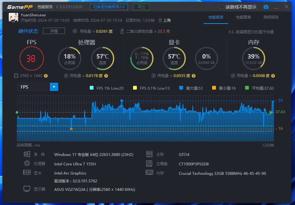 从统计数据来看,《原神》这款游戏在零刻 GTi14 上的表现如下:FPS 平均值保持在 30 左右,处理器占用 18%,显卡占用 75% 以上,内存占用 39%。从这些数据可以看出,处理器和内存的压力不大,而显卡负载较高。后期可以通过扩展外置显卡来提升游戏体验,从而实现更高的帧率和更流畅的画质表现。