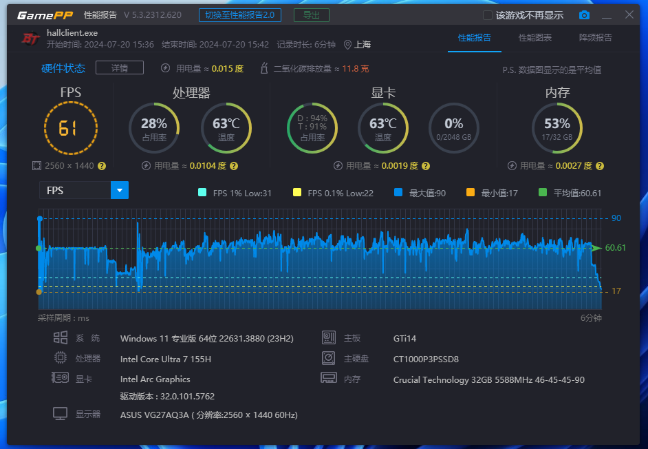 零刻 GTi14 在2K画质下,游戏帧率基本能够稳定在 61 帧左右,确保操作流畅、响应迅速,使玩家在激烈的游戏环境中能够保持精确控制和快速反应。