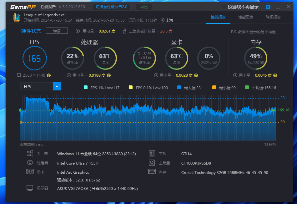 英雄联盟这款游戏相对来说不需要过高的硬件要求,实测中,使用了2560x1440分辨率,并将游戏特效调至最高,通过游戏加加软件记录的数据显示,FPS 平均值保持在165,非常流畅。在团战场景下也能够保持流畅的游戏体验。在实际使用过程中,可以根据自己的需求选择适合的游戏设置和画质,进一步提高游戏性能和体验。
