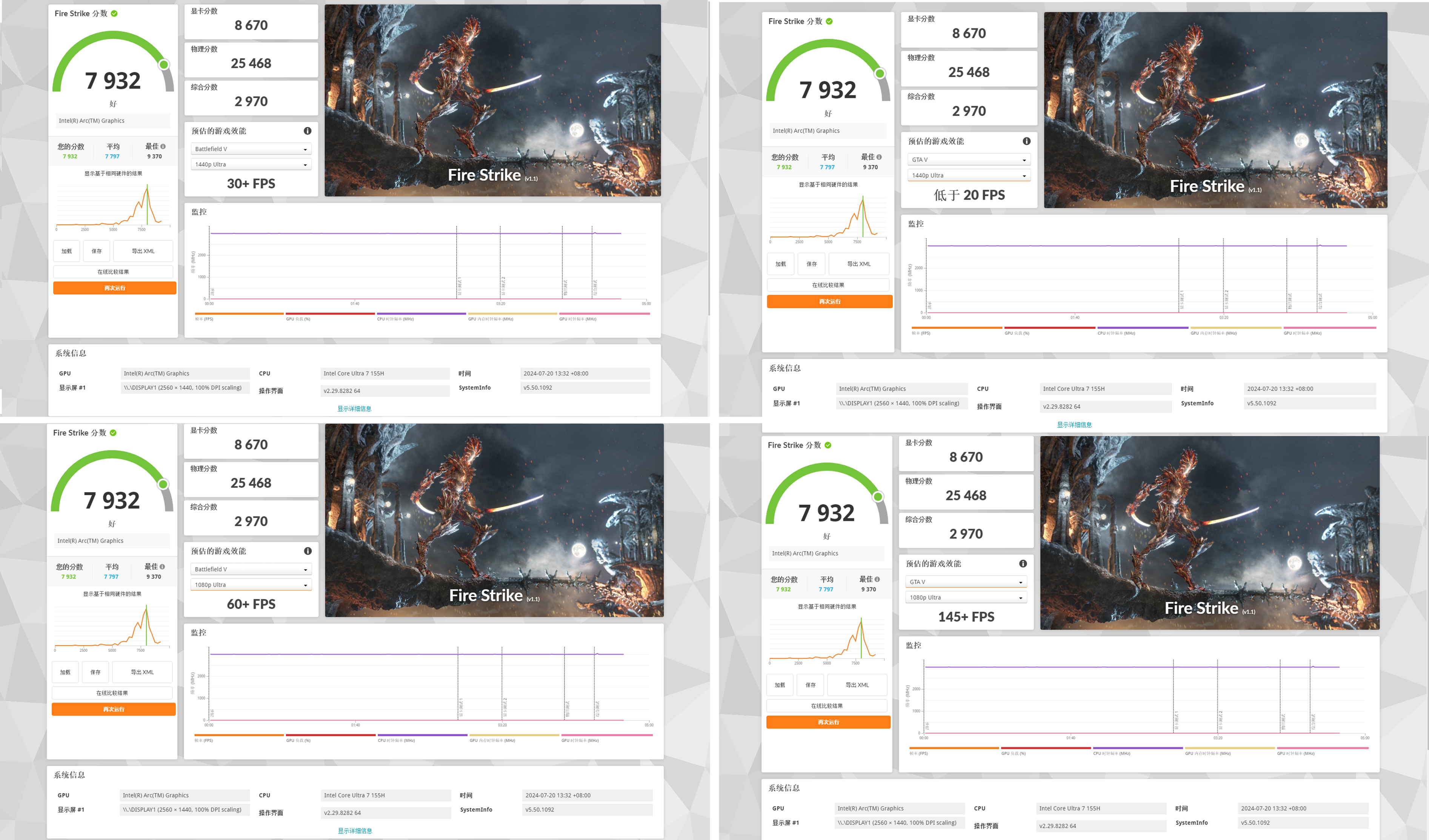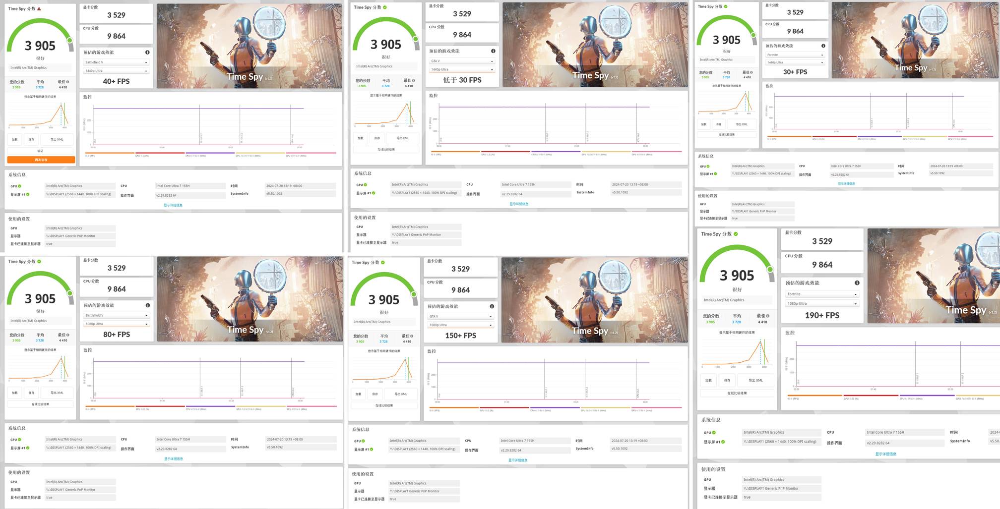 零刻 GTi14 搭载的英特尔 Core Ultra7 155H 集成了 Arc Graphics 核显(俗称锐炫),其最大动态频率为 2.2GHz,性能是上一代锐炬的两倍,支持光线追踪和 Xe 超级采样等先进技术。该核显对《永劫无间》、《超级人类》、《杀手 3》和《刺客信条》等多款游戏有显著的帧数提升。在 3DMark 测试中,使用 Fire Strike、Time Spy 和 Night Raid 三个基准项目来评估,看下效果: