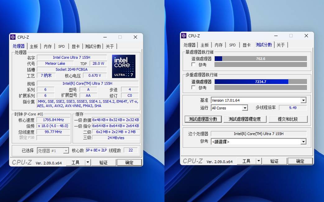 酷睿 Ultra7 155H 处理器,采用 7nm 工艺的混合架构,拥有 14 个核心(4 性能核心 P 核、8 能效核心 E 核和 2 低功耗能效核心 LPE),共 18 线程。性能核心最高睿频可达 4.5GHz,配备 18MB 三级缓存,TDP 功耗为 28W,但在零刻 SEi14 中被调教到 54W。该处理器集成了 CPU、GPU 和 NPU,属于三合一设计,在 CPU-Z 的跑分测试中,单核成绩为 762.6,多核成绩为 7234.7,性能强悍,能够轻松应对生产力任务、游戏和 AI 处理需求。