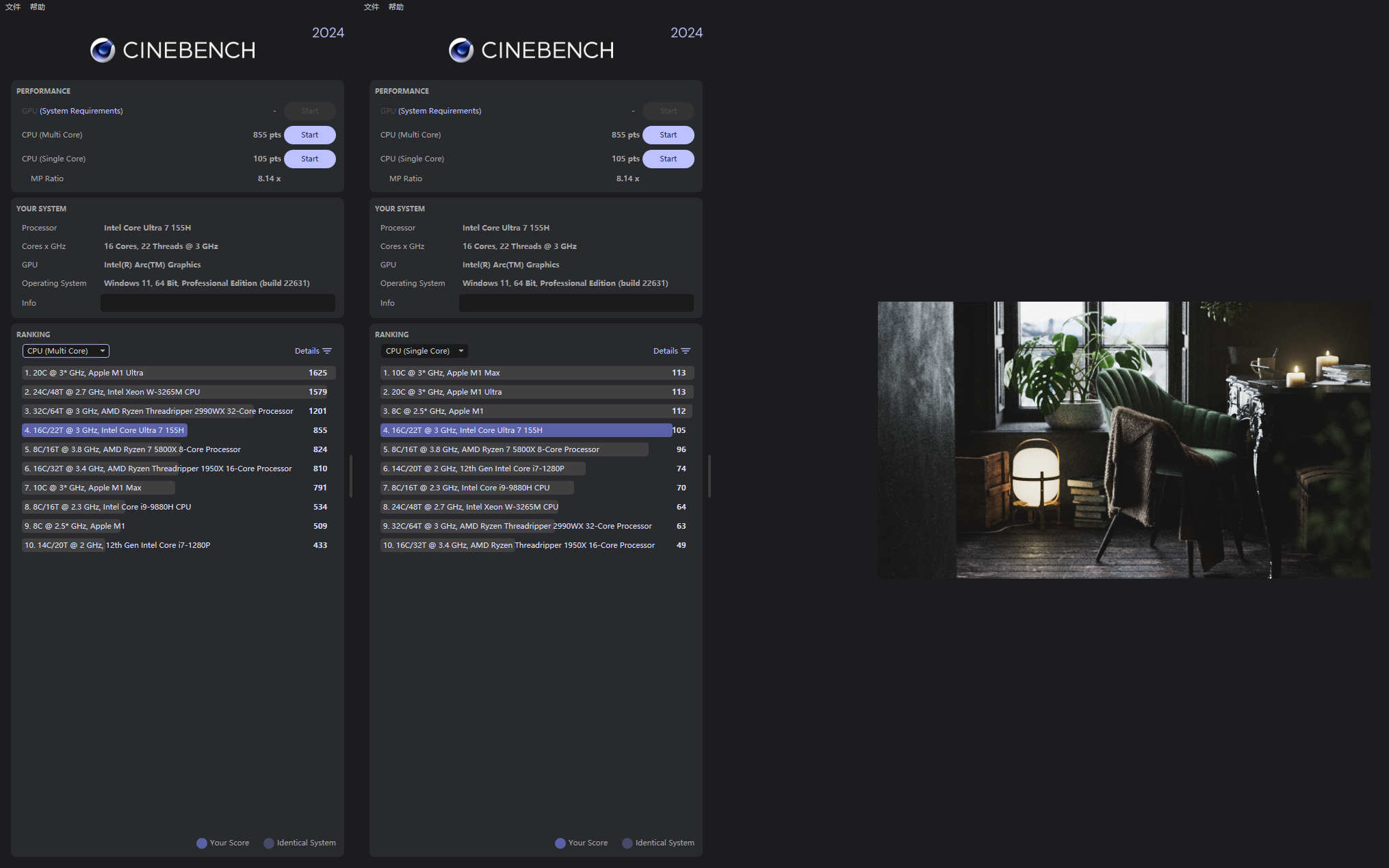 CINEBENCH 2024 测试结果显示,零刻 GTi14单核成绩为 105 分,多核成绩为 855 分,排名在序列中的第四位。这表明该设备在使用 Photoshop 或 3Dmax 等对图像或视频编辑有较高性能要求的软件时,能够轻松胜任各种任务。