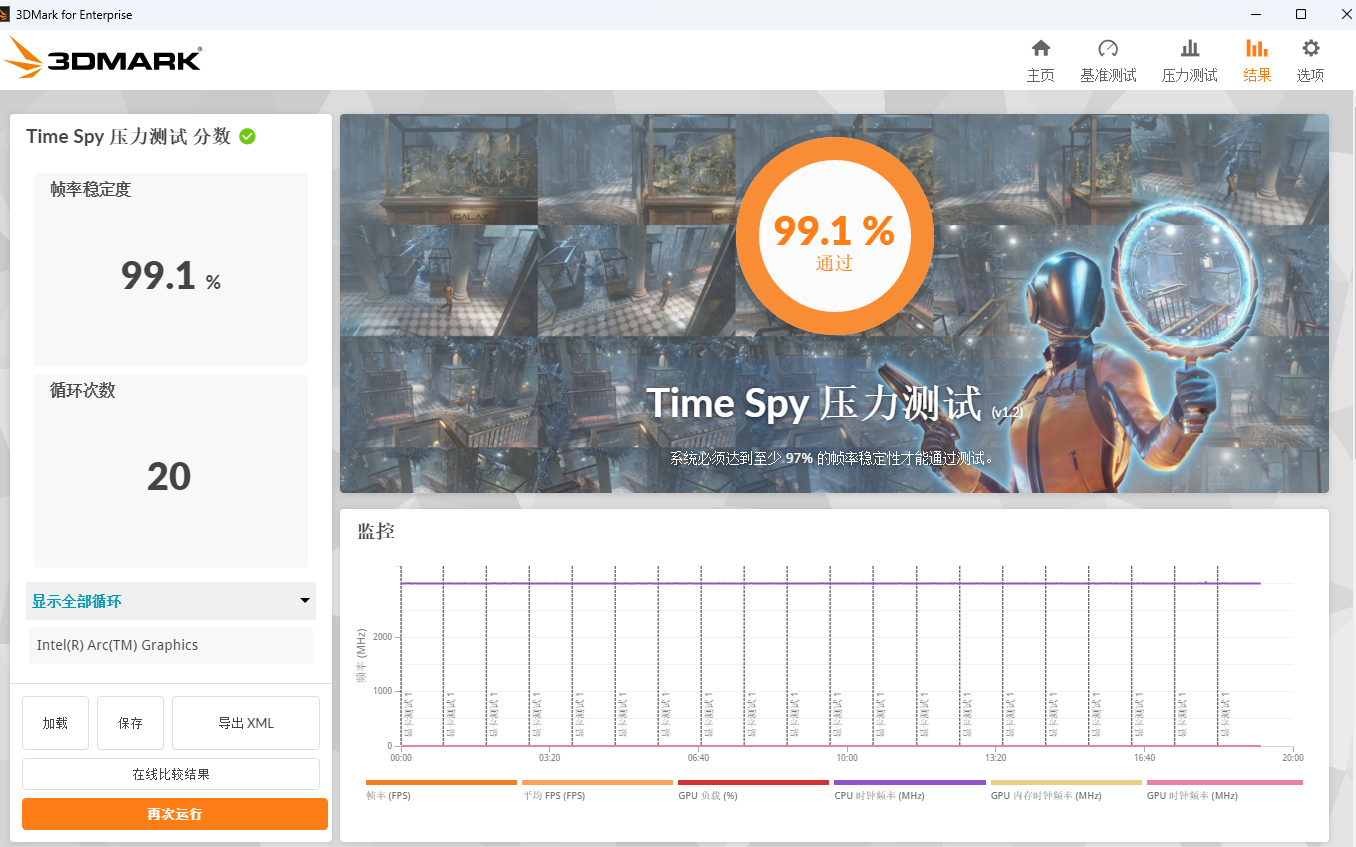 此外,使用 3DMark 进行了专业的 Time Spy 压力测试,结果显示 FPS 稳定度达 99.1%。由此可见,零刻 GTi14基本上能够满足热门网游及 3A 大作的流畅运行需求,并且在长时间高负载运行下依然保持稳定。