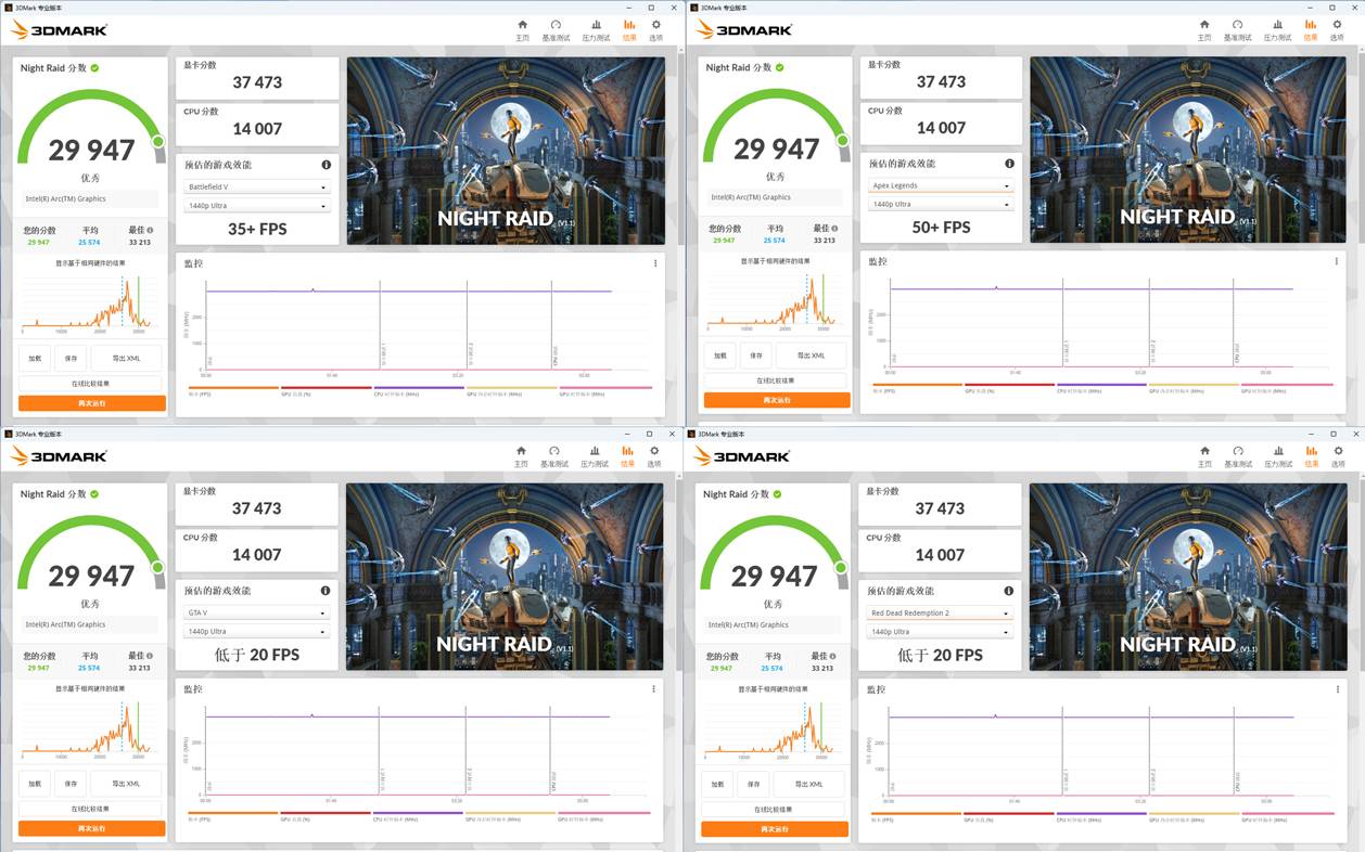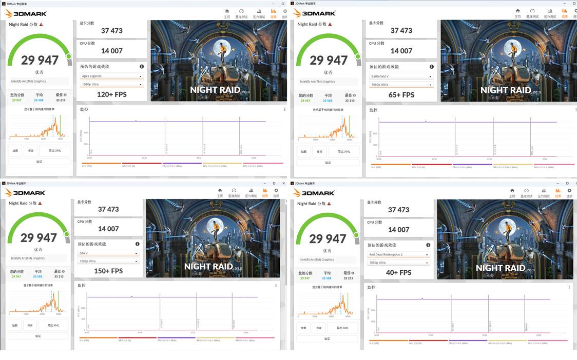 在 3DMark 的 Night Raid 测试中,对动态反射、环境光遮挡、延迟渲染、曲面细分、景深效果和复杂粒子等多个方面进行了全面测试。结果显示,其综合得分为 29947,显卡得分为 37473,CPU 得分为 14007。在 2K 分辨率下,《战地 5》可以达到 35+ FPS,《Apex Legends》50+ FPS,《GTA 5》20+ FPS,《荒野大镖客 2》低于 20 FPS。虽然在 2K 分辨率下运行稍显吃力,毕竟是一款集显,但在 1080P 分辨率下,其性能表现仍然非常出色