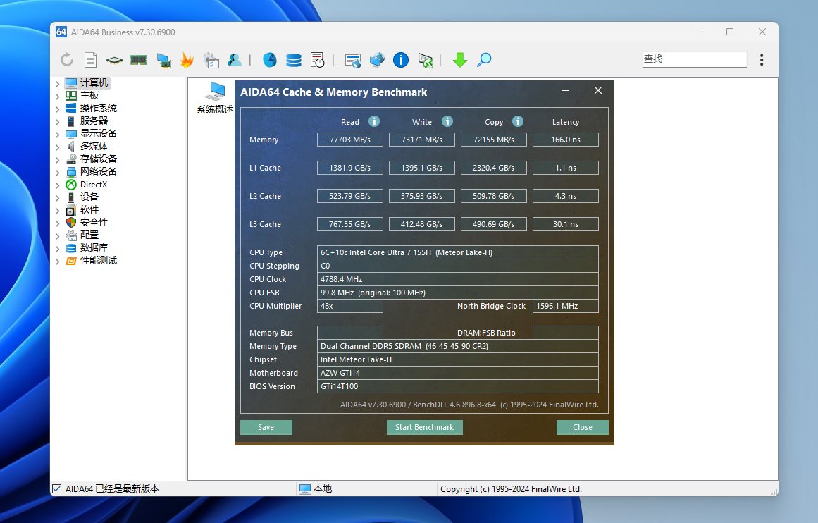 预装的两根英睿达 16GB Crucial DDR5 内存,默频为 5600MHz,组成了 32GB 双通道配置。在测试中,内存的读取速度达到 77703MB/s,写入速度为 73171MB/s,复制速度为 72155MB/s,延迟为 166.0ns,延迟有点高,应该是驱动估计还没完全适配的原因。从读写速度上来看,零刻 GTi14能够高效处理大量数据传输任务,提供流畅的操作体验,适合运行各种高负载应用和任务。