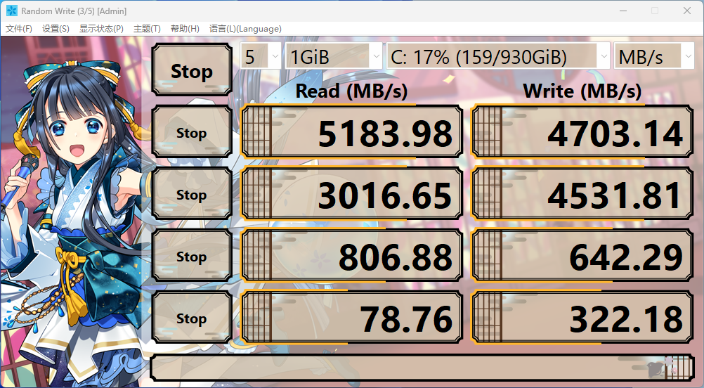 在CrystalDiskMark 测试中,顺序读取速度达 5167.30MB/s,写入速度为 4703.14MB/s。日常使用中,启动操作系统、加载应用程序、传输大文件等操作都能快速响应,满足大部分用户对高速存储的需求。